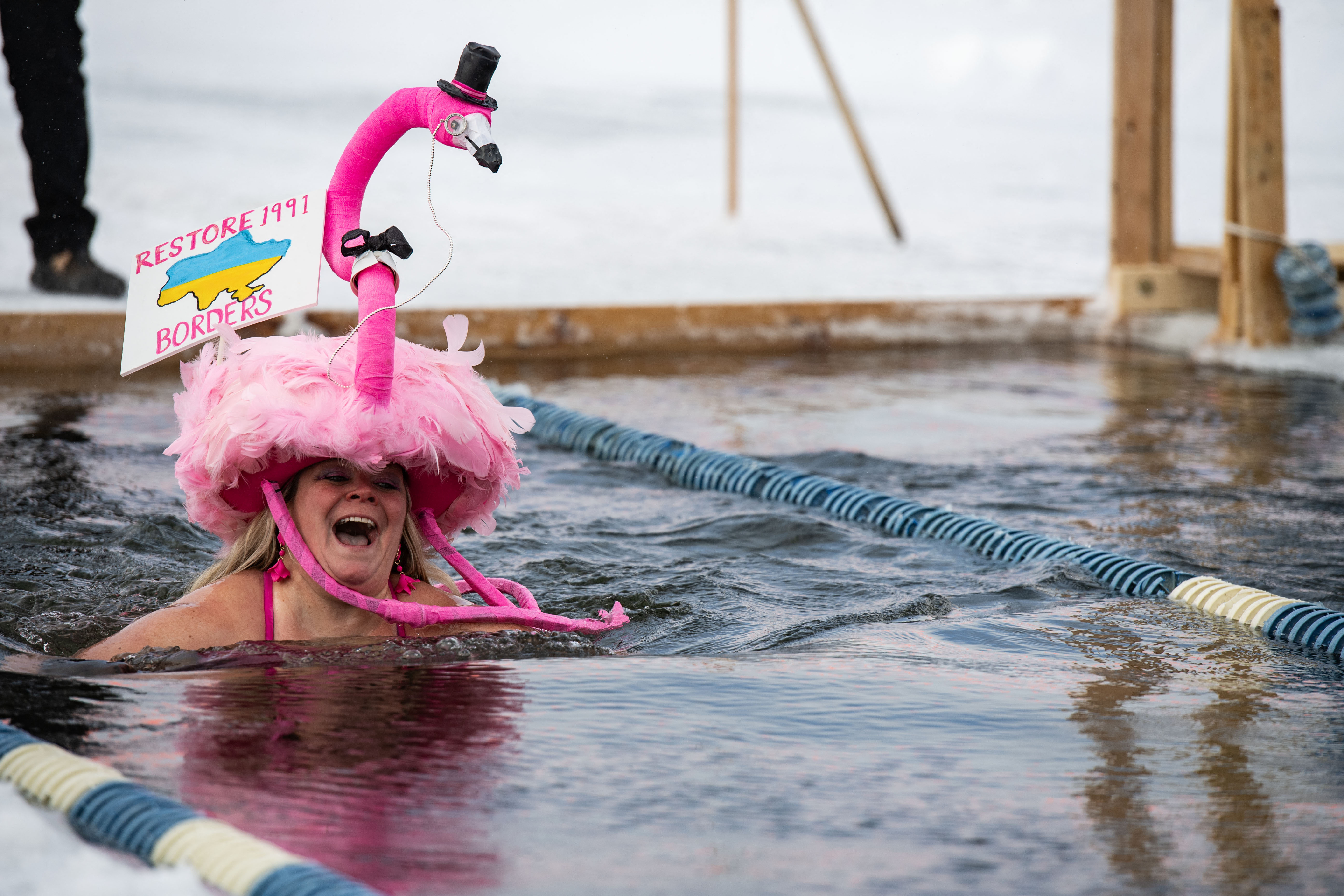 A swimmer takes part in the 25 meter hat competition swim during the Memphremagog Winter Swimming Festival at lake Memphremagog in Newport, Vermont on February 21, 2025. The event brings together cold water swimmers of all ages, the youngest being 14 and the oldest 79, to swim Olympic-style heats in near-freezing water temperatures. (Photo by Joseph Prezioso/AFP Photo)