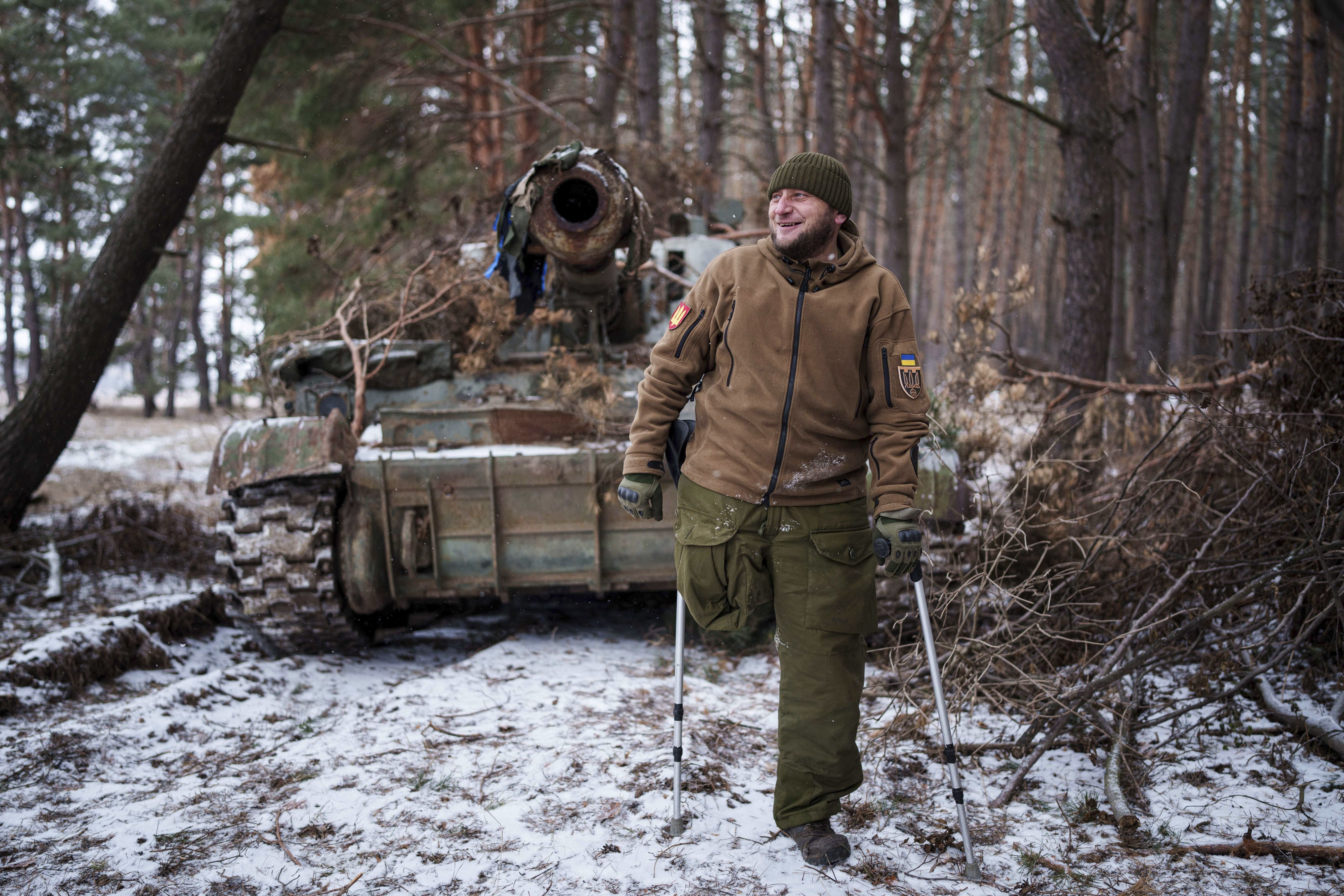 Leonid Lobchuk, a soldier with Ukraine's 127th brigade who lost a leg in combat in eastern Ukraine in 2015, smiles in front of a self propelled howitzer in Kharkiv region region, Ukraine, February 10, 2025. (Photo by Evgeniy Maloletka/AP Photo)