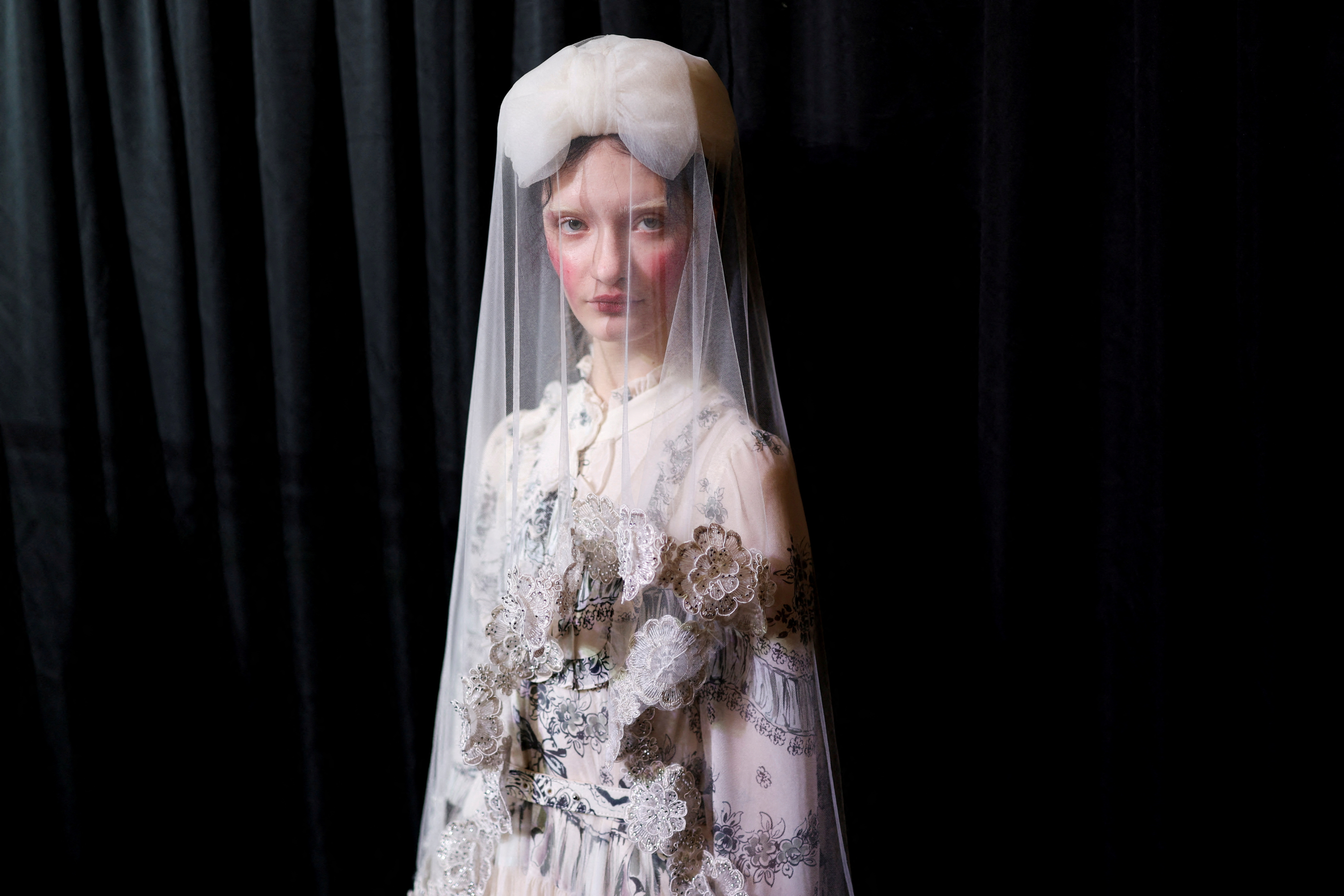 A model poses backstage during preparations for the Bora Aksu show at London Fashion Week in London, Britain, on February 21, 2025. (Photo by Isabel Infantes/Reuters)