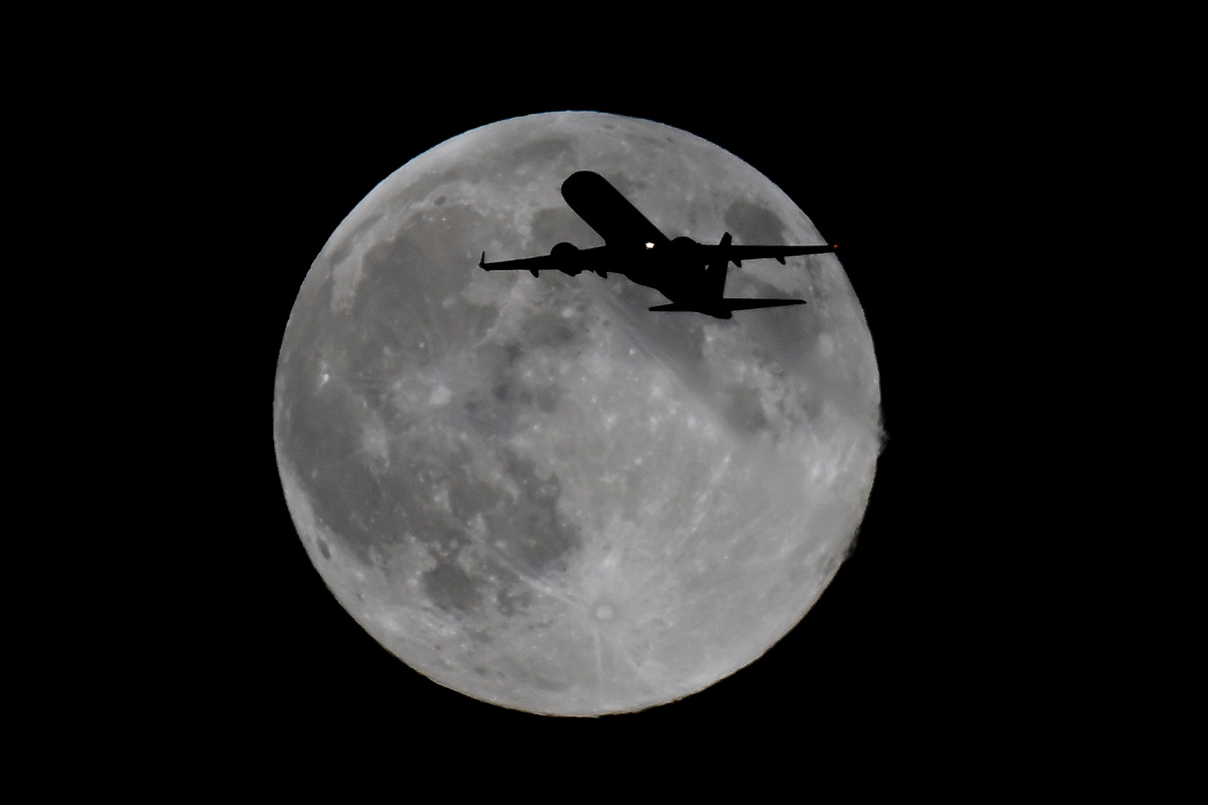 A British Airways Cityflyer from Glasgow heading for London City airport flies past the last Supermoon of 2024 rises in the evening of 15th November 2024. The full Beaver Moon ends a run of four consecutive supermoons throughout 2024. (Photo by Martin Dalton/Rex Features/Shutterstock)
