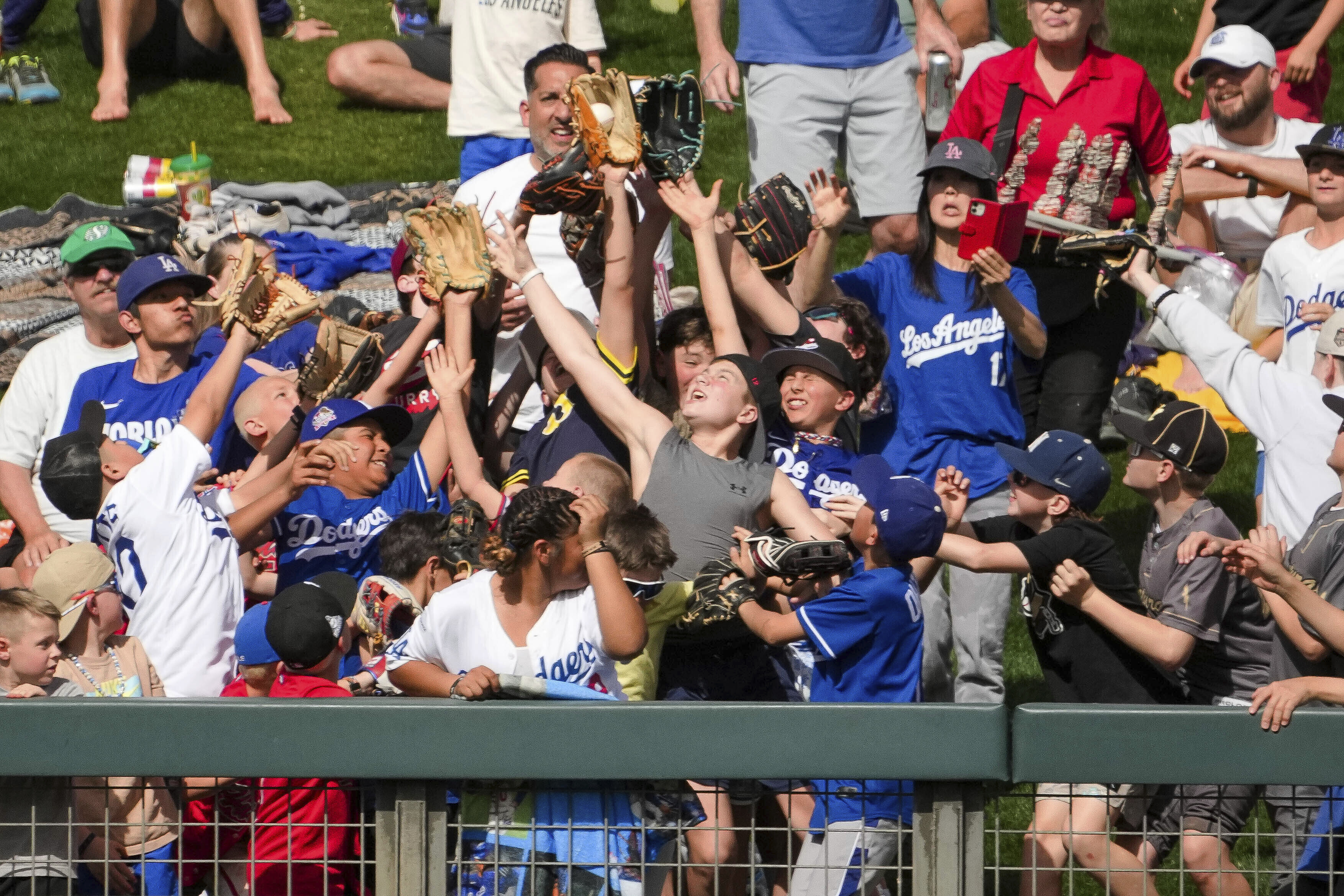 A fan catches a baseball thrown to them by Los Angeles Dodgers outfielder Tommy Edman (25) during a spring training baseball game against the Colorado Rockies, Thursday, February 27, 2025, in Scottsdale, Ariz. (Photo by Darryl Webb/AP Photo)
