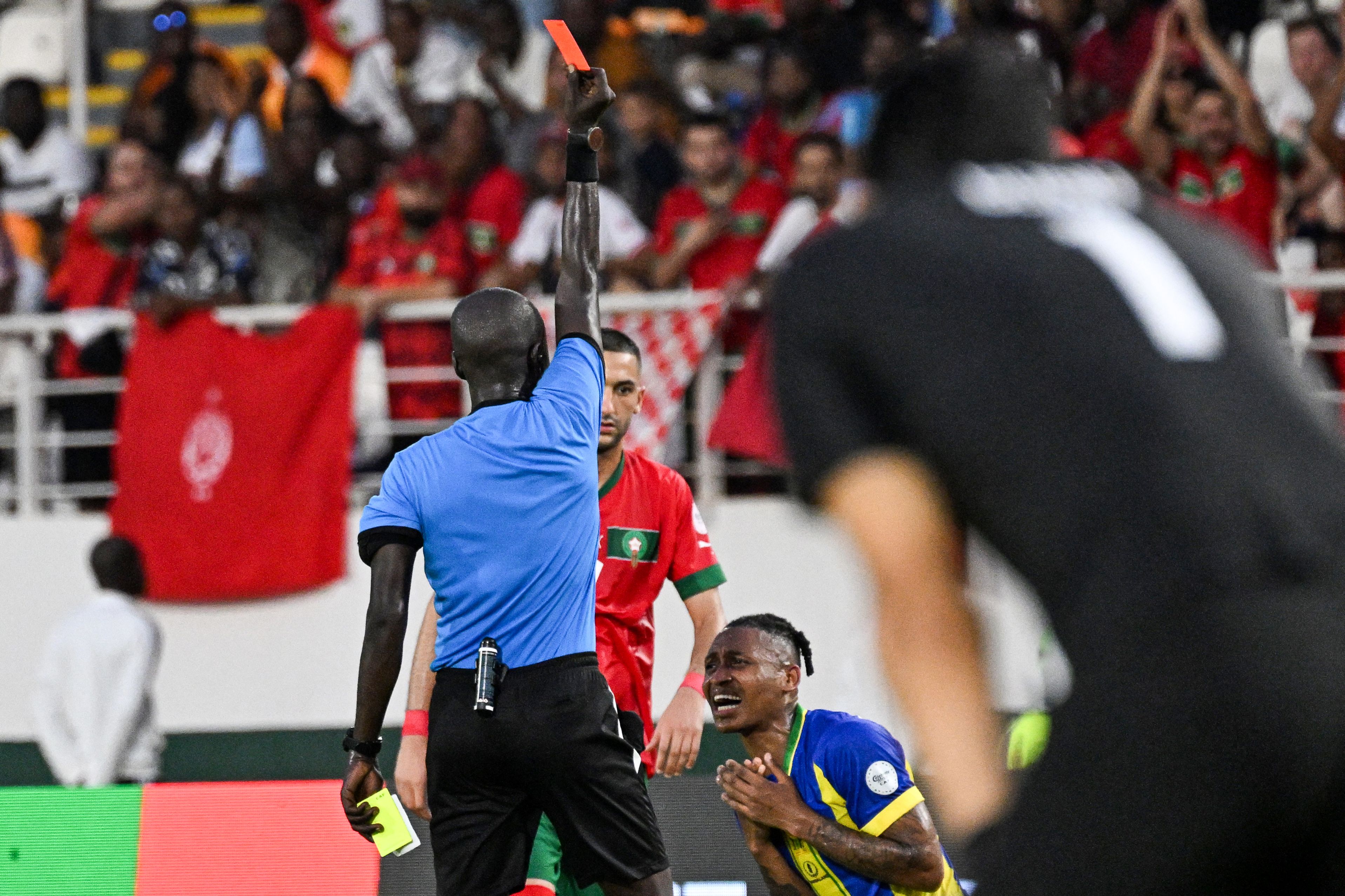 Chadian referee Al Hadi Allou Mahamat (CL) shows a red card to Tanzania's defedner #20 Novatus Miroshi (CR) during the Africa Cup of Nations (CAN) 2024 group F football match between Morocco and Tanzania at Stade Laurent Pokou in San Pedro on January 17, 2024. (Photo by Sia Kambou/AFP Photo)