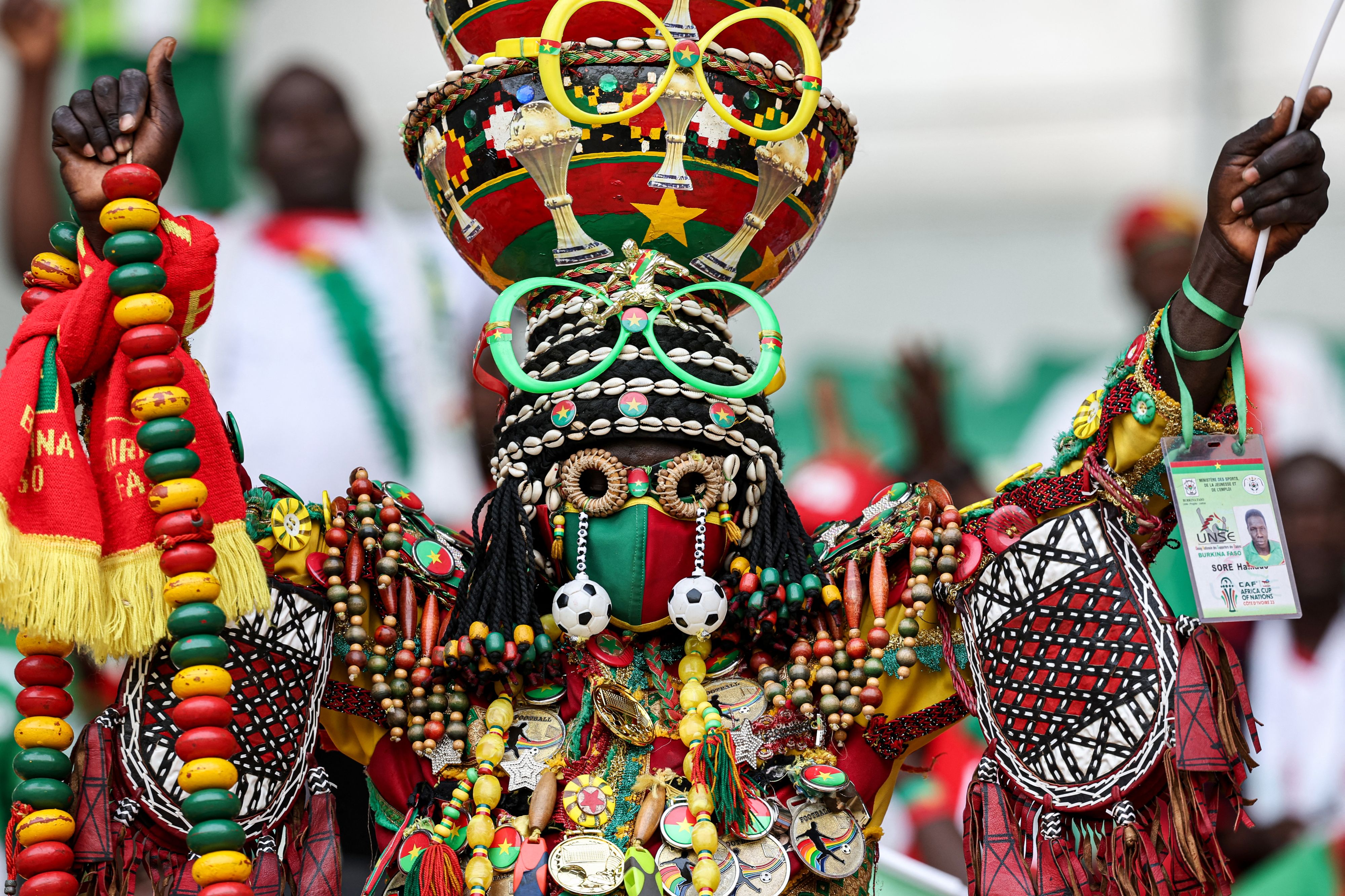 A Burkina Faso's supporter, costumed, gestures ahead of the Africa Cup of Nations (CAN) 2024 round of 16 football match between Mali and Burkina Faso at the Amadou Gon Coulibaly Stadium in Korhogo on January 30, 202. (Photo by Fadel Senna/AFP Photo)