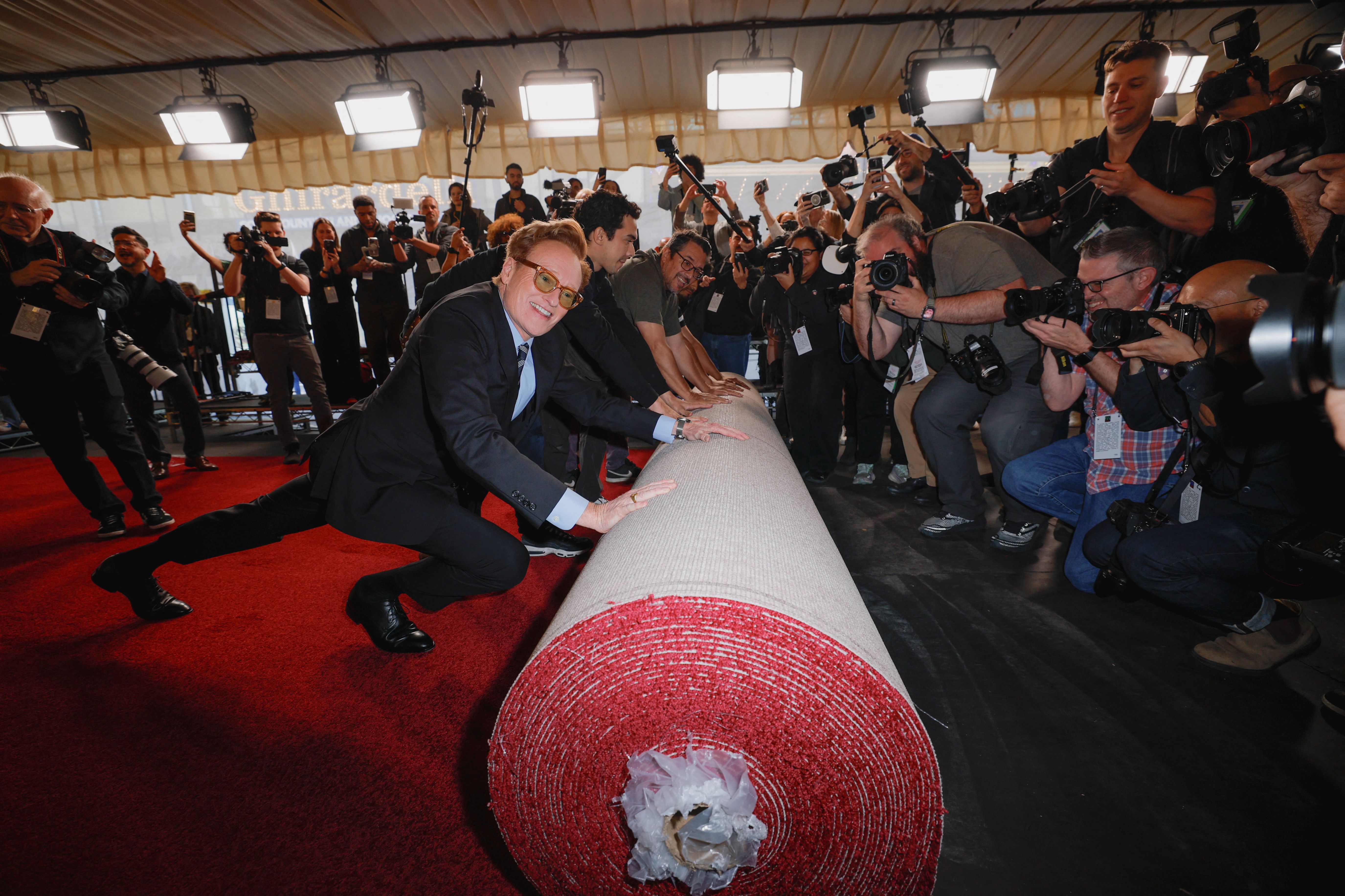 Academy Awards host Conan O'Brien pushes the rolled red carpet during its rollout for the 97th Academy Awards in Los Angeles, California, U.S., February 26, 2025. (Photo by Mike Blake/Reuters)