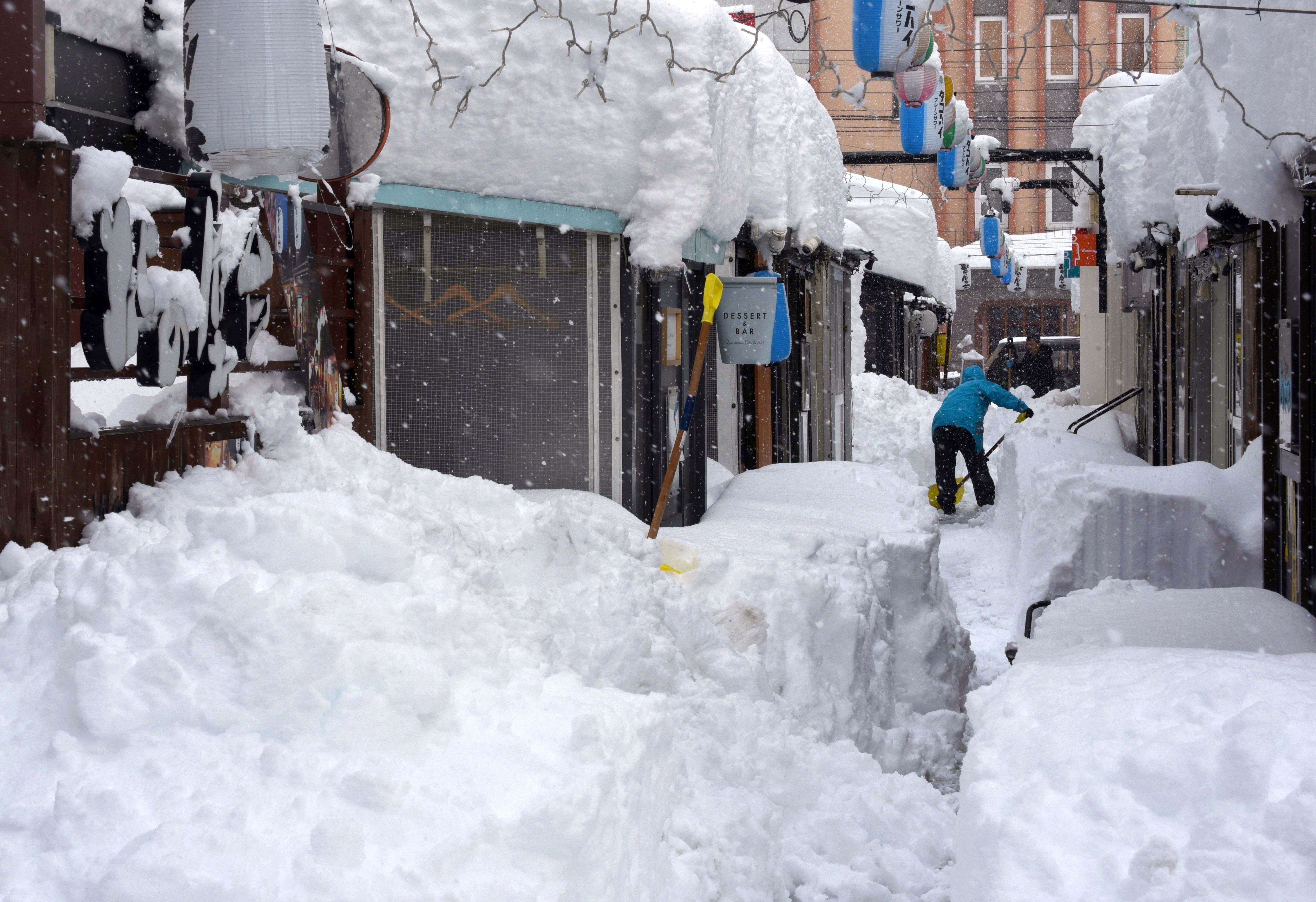 A man digs snow following heavy snowfall in Obihiro, Hokkaido, northern Japan, 04 February 2025. On 05 February 2025, the coldest air of the winter persisted over the Japanese archipelago, bringing heavy snowfall to Hokkaido and areas along the Sea of Japan coast. The cold front is expected to continue for several days, and the Japan Meteorological Agency (JMA) has issued warnings about heavy snow and blizzards, which already led to school closures and transportation disruptions. (Photo by JIJI Press/EPA/EFE)