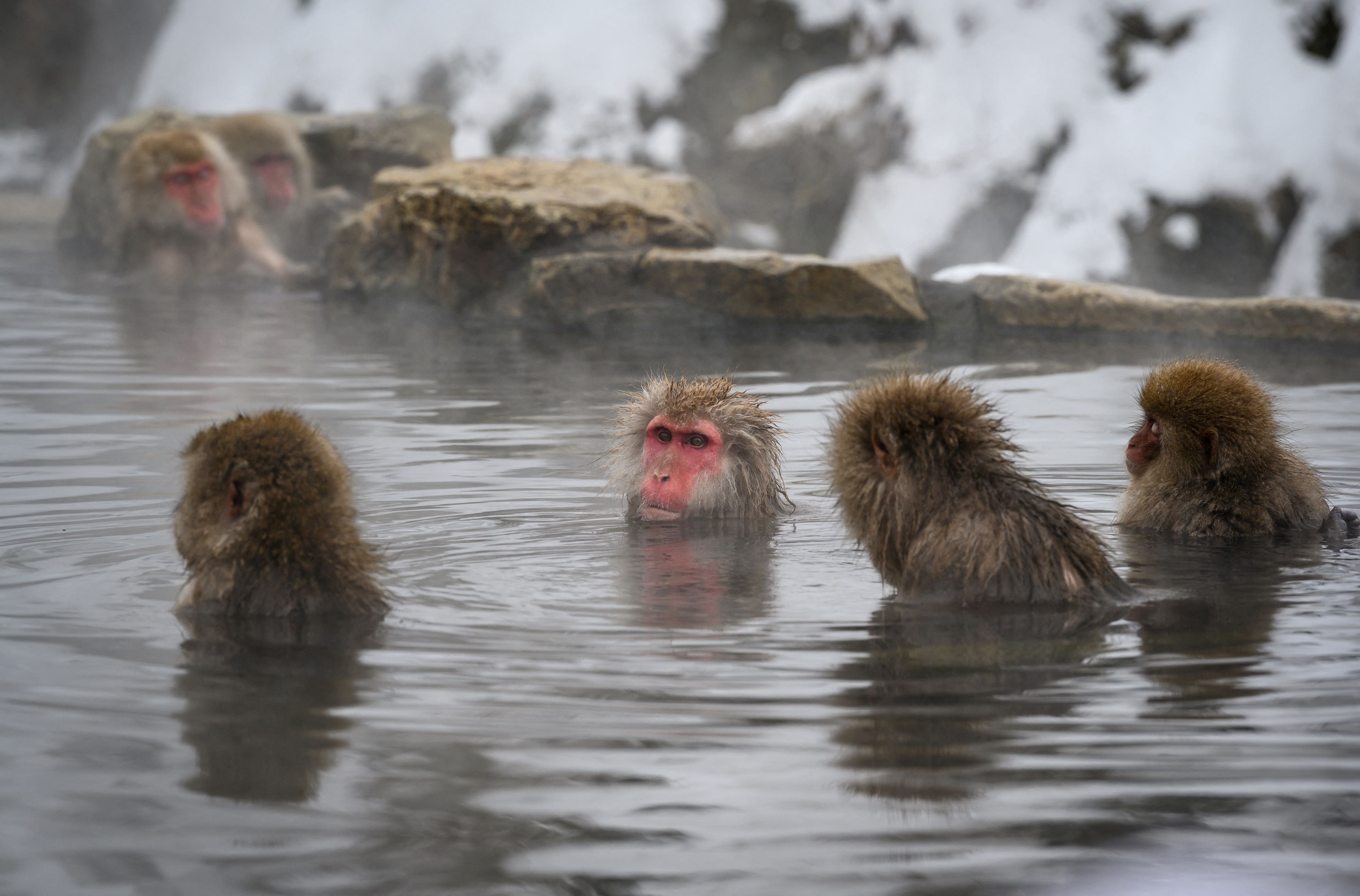 This photo taken on February 7, 2025 shows Japanese macaques, commonly referred to as “snow monkeys”, taking an open-air hot spring bath, or “onsen” at the Jigokudani (Hell's Valley) Monkey Park in the town of Yamanouchi, Nagano prefecture. (Photo by Mladen Antonov/AFP Photo)
