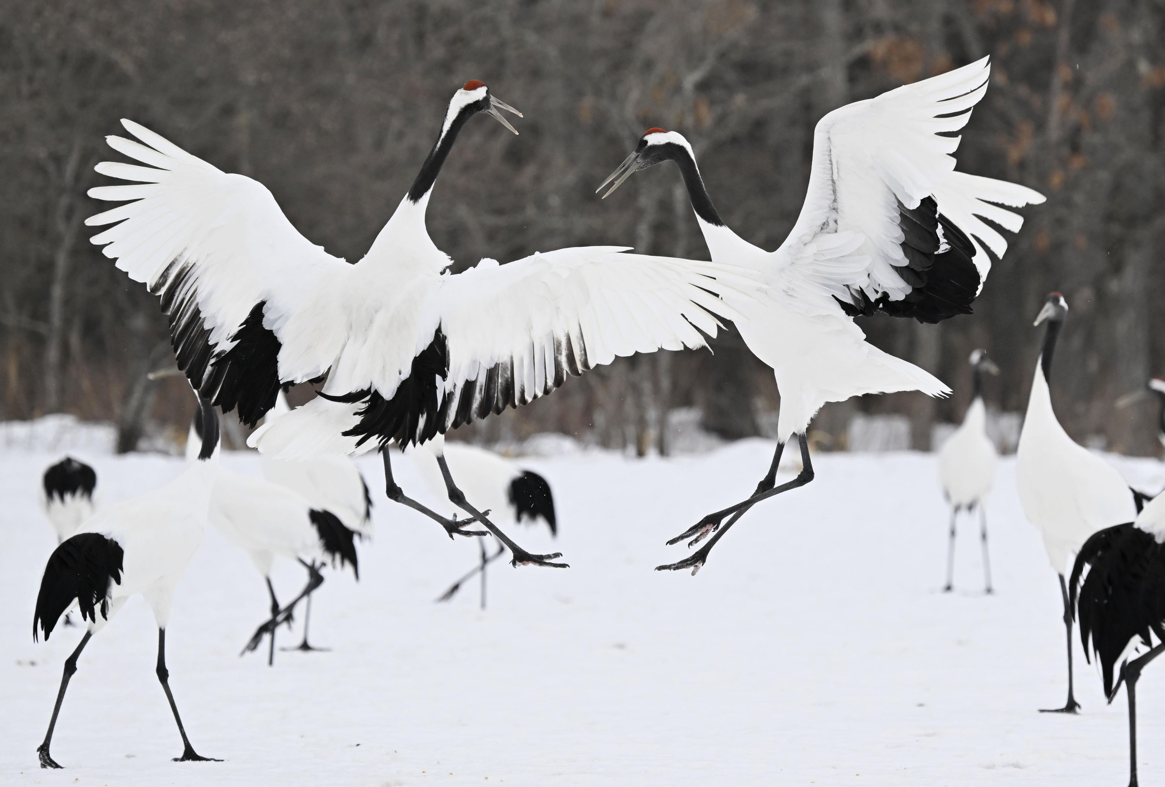 Red-crowned cranes, designated as a Japanese special national treasure, are in mating season on their snow-covered feeding grounds in the Hokkaido village of Tsurui, northern Japan, on February 17, 2025. (Photo by Kyodo/Newscom/Avalon)