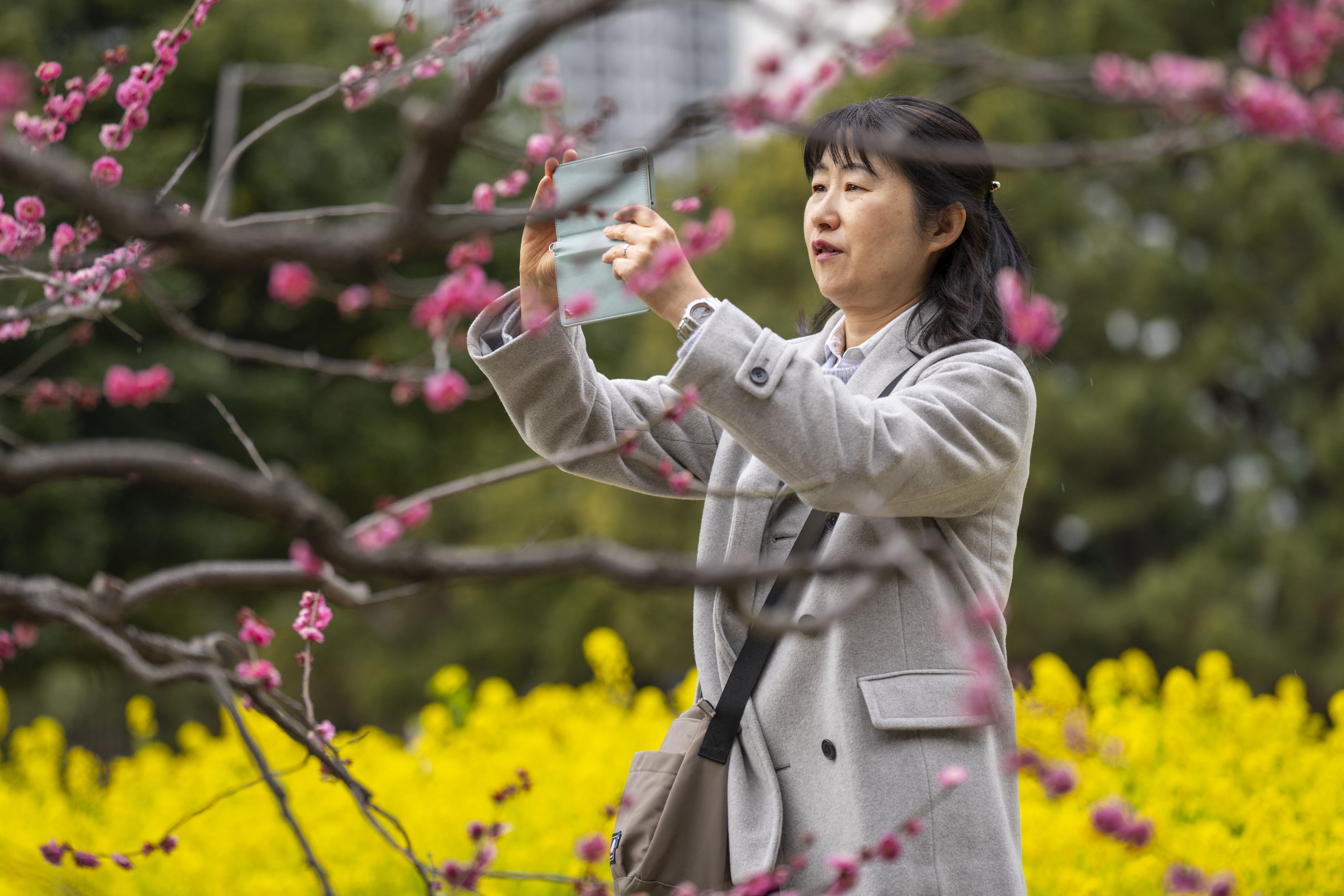 A woman takes photographs of a plum tree as rape blossoms are seen in the background at a park in Tokyo on February 17, 2025. (Photo by Yuichi Yamazaki/AFP Photo)