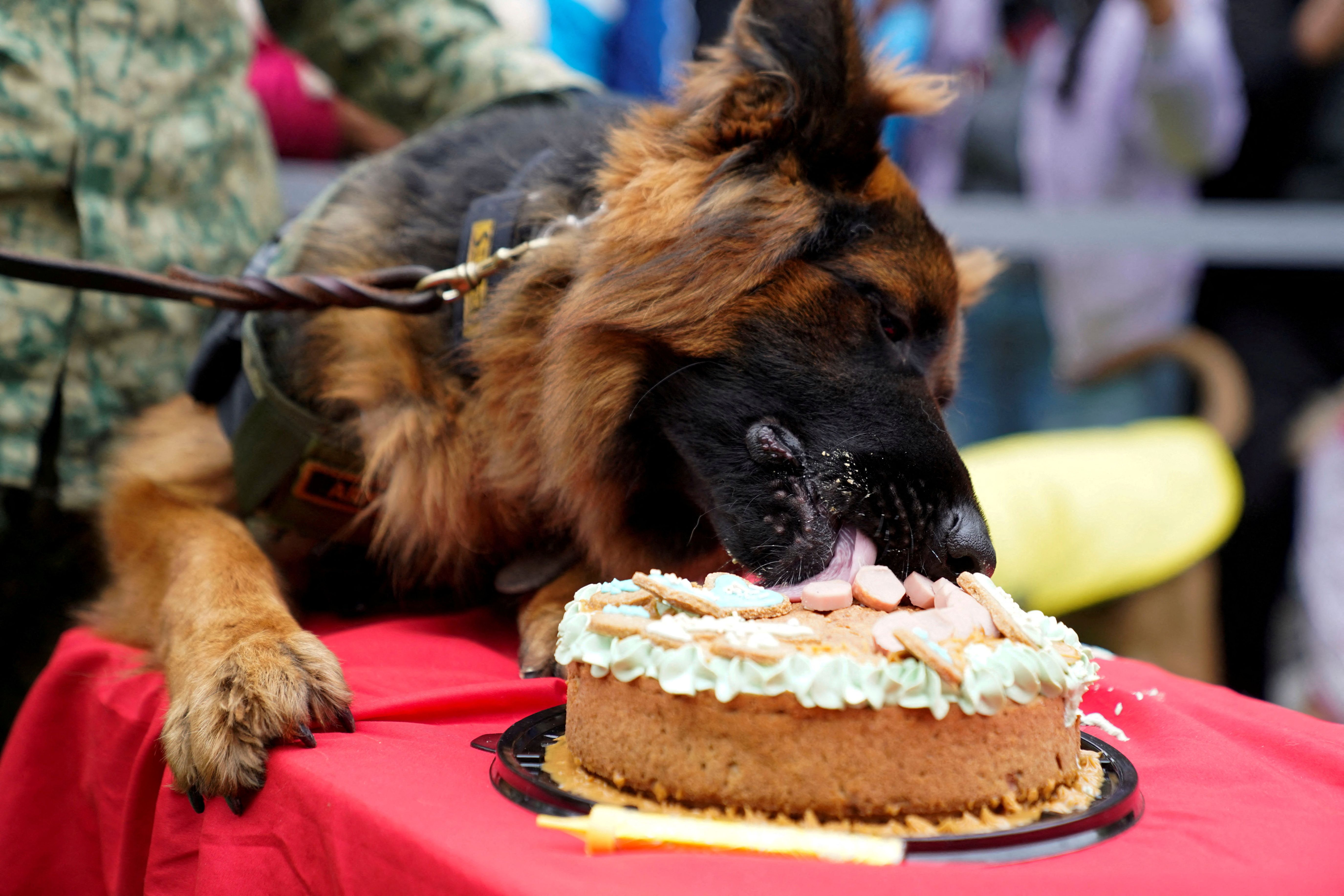 Soldier Arkadas, a German Shepherd that was donated by the Turkish government as a gesture of gratitude following the death of Mexican rescue dog Proteo during the search for survivors in last years' quake in Turkey, eats his birthday cake marking his first birthday in Mexico City on January 7, 2024. (Photo by Toya Sarno Jordan/Reuters)