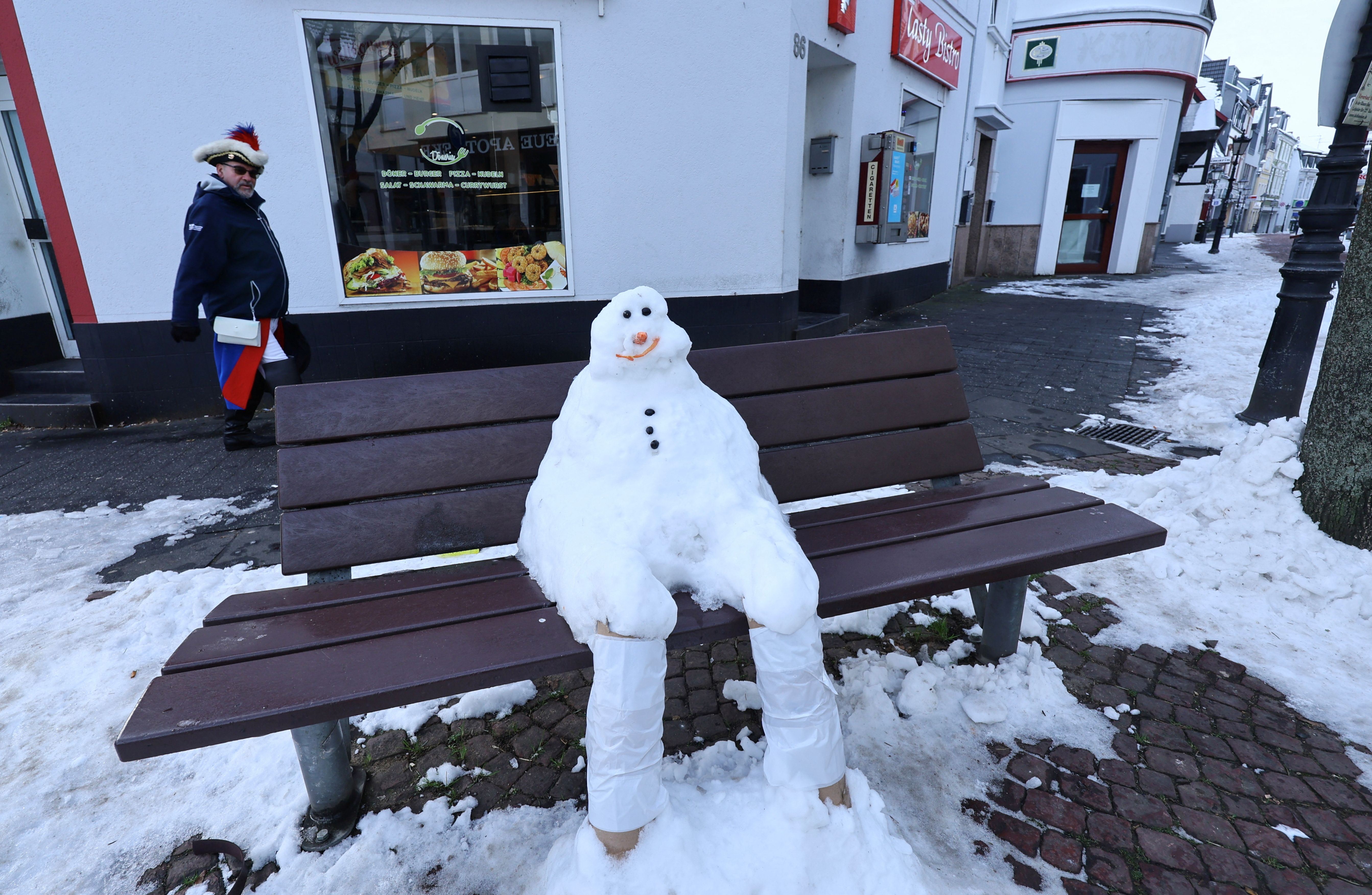 A carnevalist walks past a snowman placed on a bench in Bad Honnef near Bonn, Germany on January 21, 2024. (Photo by Wolfgang Rattay/Reuters)