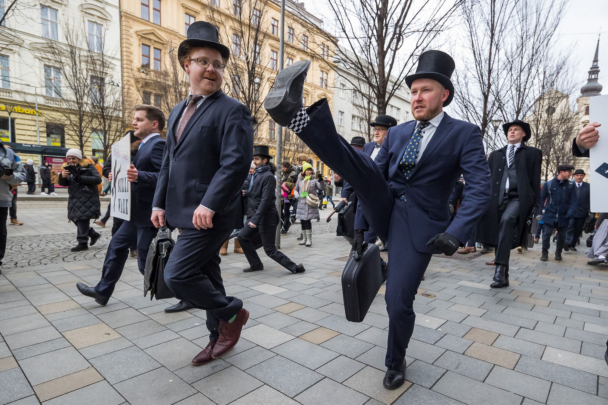 About 300 participants in black suits and suitcases take part on January 7, 2024 in a “Silly Walk” referring to a famous sketch by British comedy group Monty Python at Brno, south Moravia, Czech Republic. The march passes through the center of Brno as fans of the Monty Python comedy troupe around the world are celebrate January 7 as 'International Silly Walk Day'. (Photo by Radek Mica/AFP Photo)