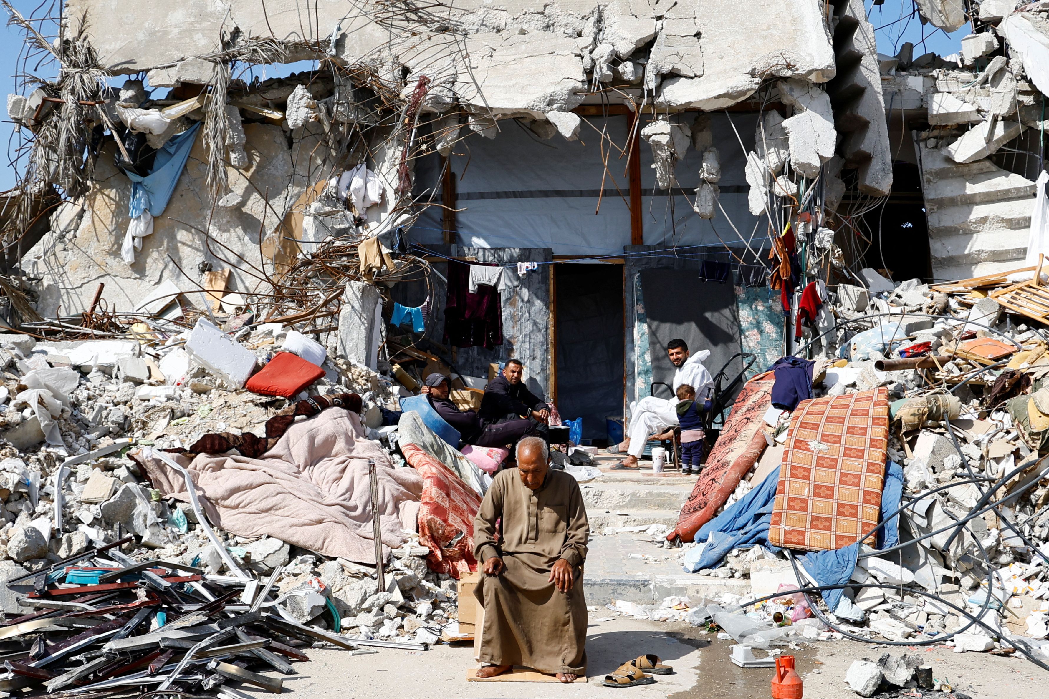 Palestinians sit amidst the rubble of buildings destroyed during the Israeli offensive, amid a ceasefire between Israel and Hamas, in Rafah in the southern Gaza Strip on February 16, 2025. (Photo by Hatem Khaled/Reuters)