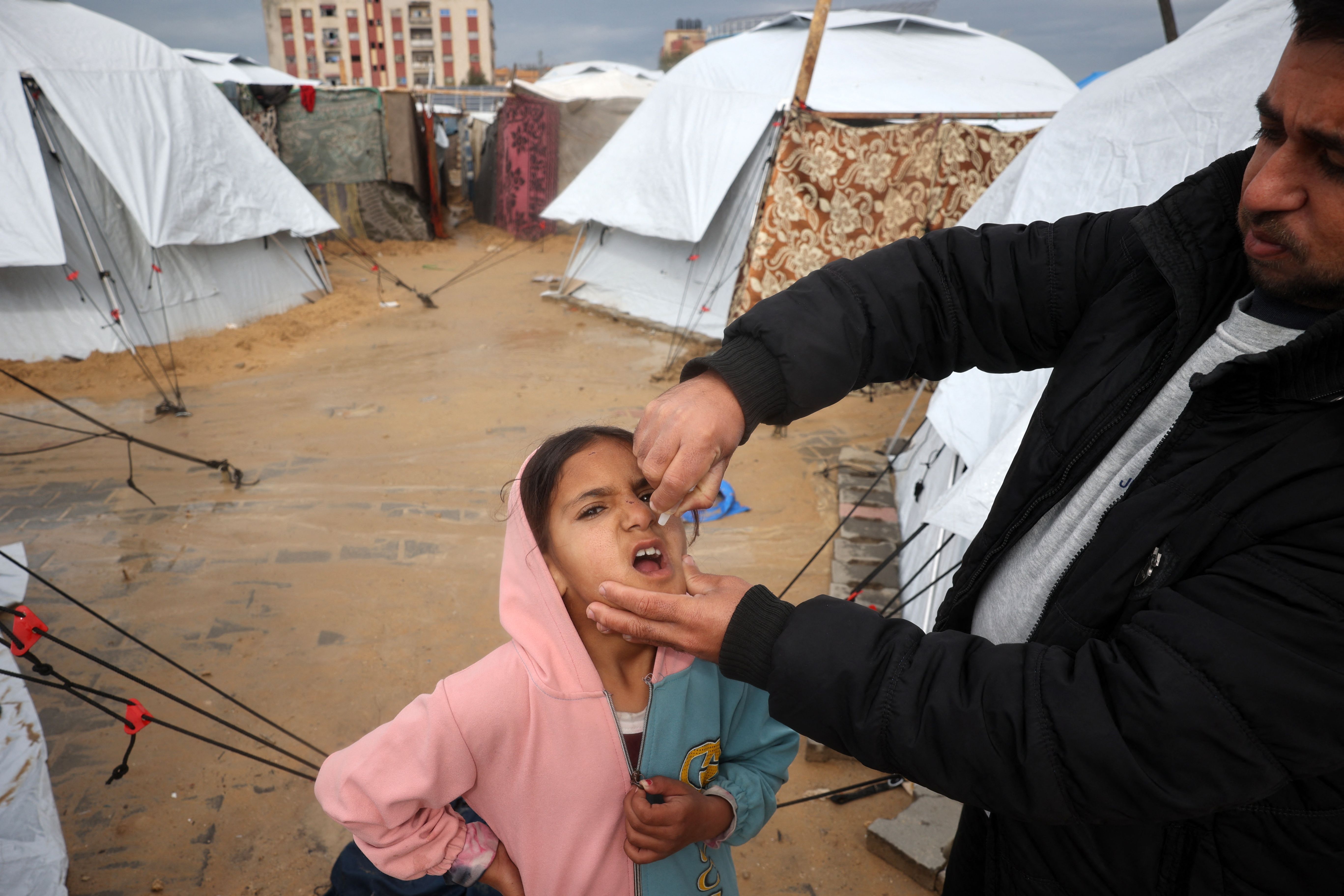 A Palestinian child receives a polio vaccine at a camp for displaced people in Nuseirat in the central Gaza Strip on February 23, 2025, a day after the third mass polio vaccination campaign began in Gaza, with the aim of delivering the first dose to nearly 600,000 children across the Palestinian territory. The vaccination campaign involves multiple UN agencies, including the Israeli-boycotted UN Relief and Works Agency for Palestine refugees (UNRWA), and comes at a time when Israel and Hamas are observing a ceasefire that has largely halted the fighting. (Photo by Eyad Baba/AFP Photo)