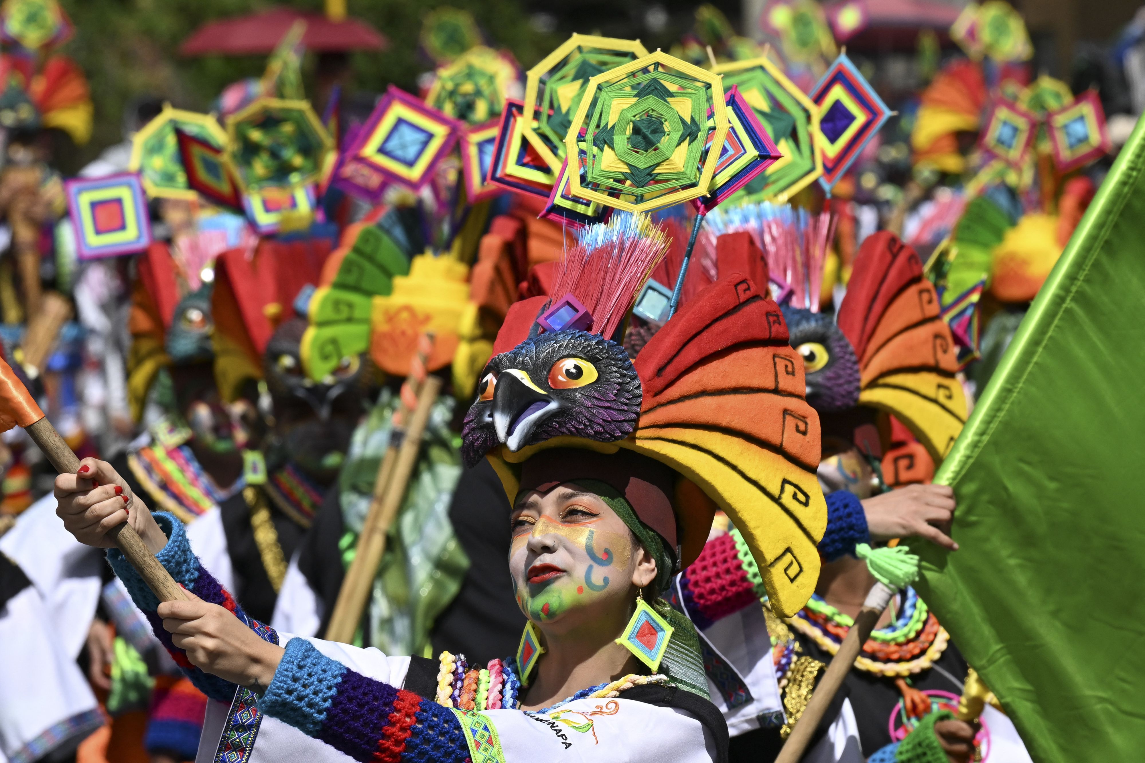 Revellers take part in the “Chant to the Earth” parade during the Carnival of Blacks and Whites in Pasto, Colombia on January 3, 2024. The Carnival has its origins in a mix of Andean, Amazonian and Pacific cultural expressions, and it celebrates the ethnic diversity in the region and was proclaimed by UNESCO as intangible cultural heritage in 2009. (Photo by Joaquin Sarmiento/AFP Photo)