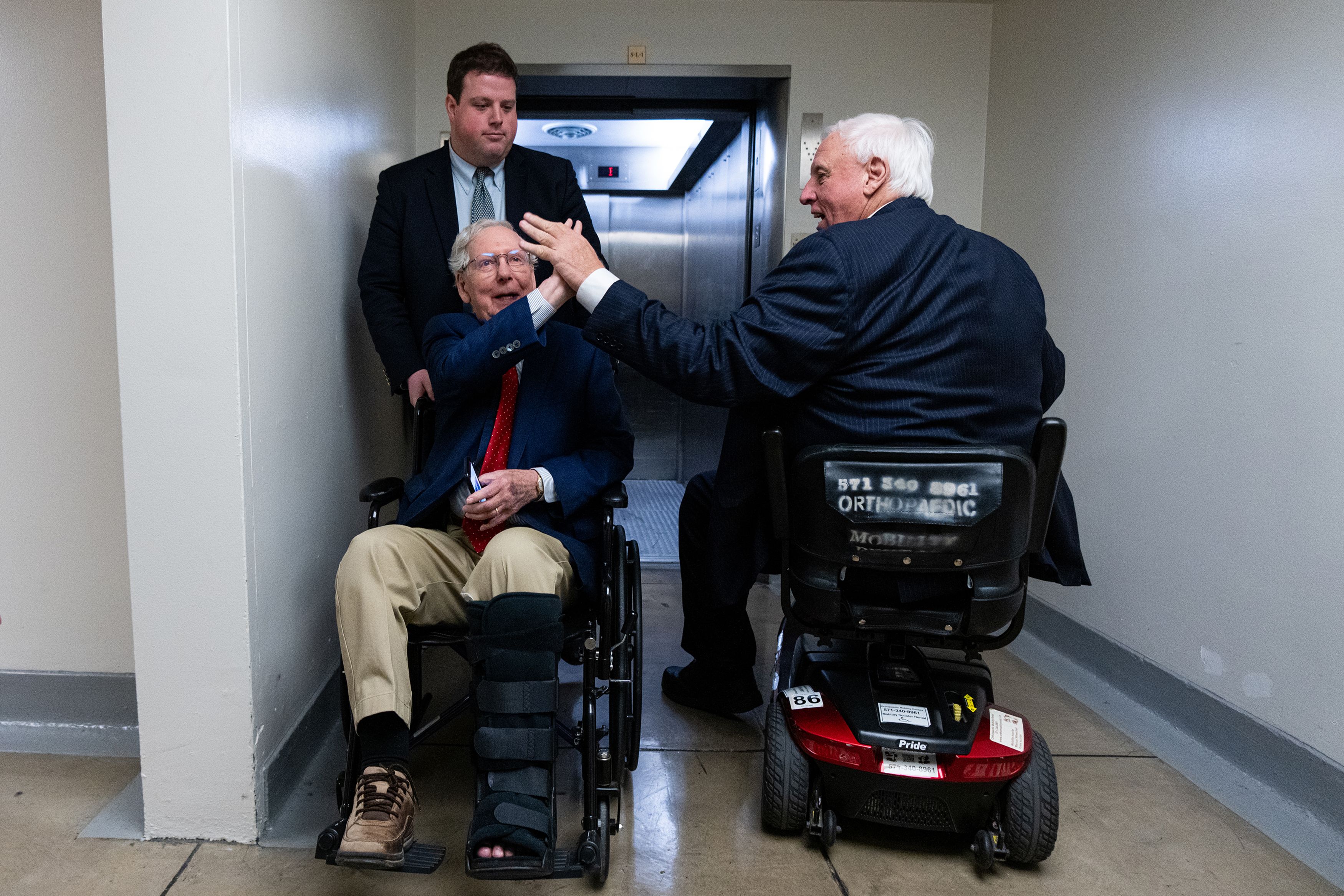 US Sens. Mitch McConnell, left, and Jim Justice high-five each other near an elevator at the US Capitol on Thursday, February 20, 2025. McConnell, the former Senate Republican leader, announced that day that he would not be running for reelection in 2026. (Photo by Bill Clark/CQ-Roll Call, Inc/Getty Images)