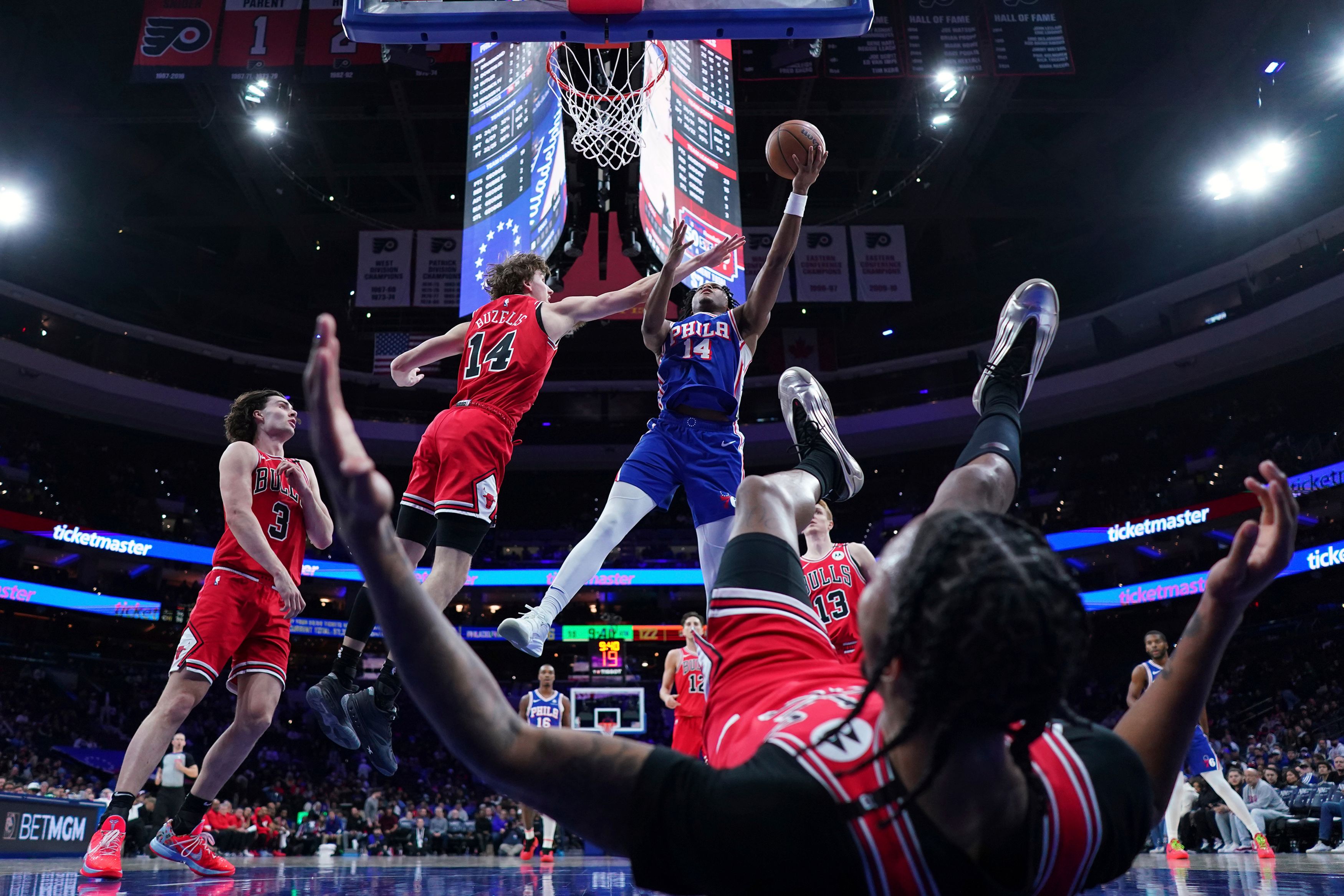 The Philadelphia 76ers' Ricky Council IV is defended by the Chicago Bulls' Matas Buzelis during an NBA game in Philadelphia on Monday, February 24, 2025. (Photo by Matt Slocum/AP Photo)