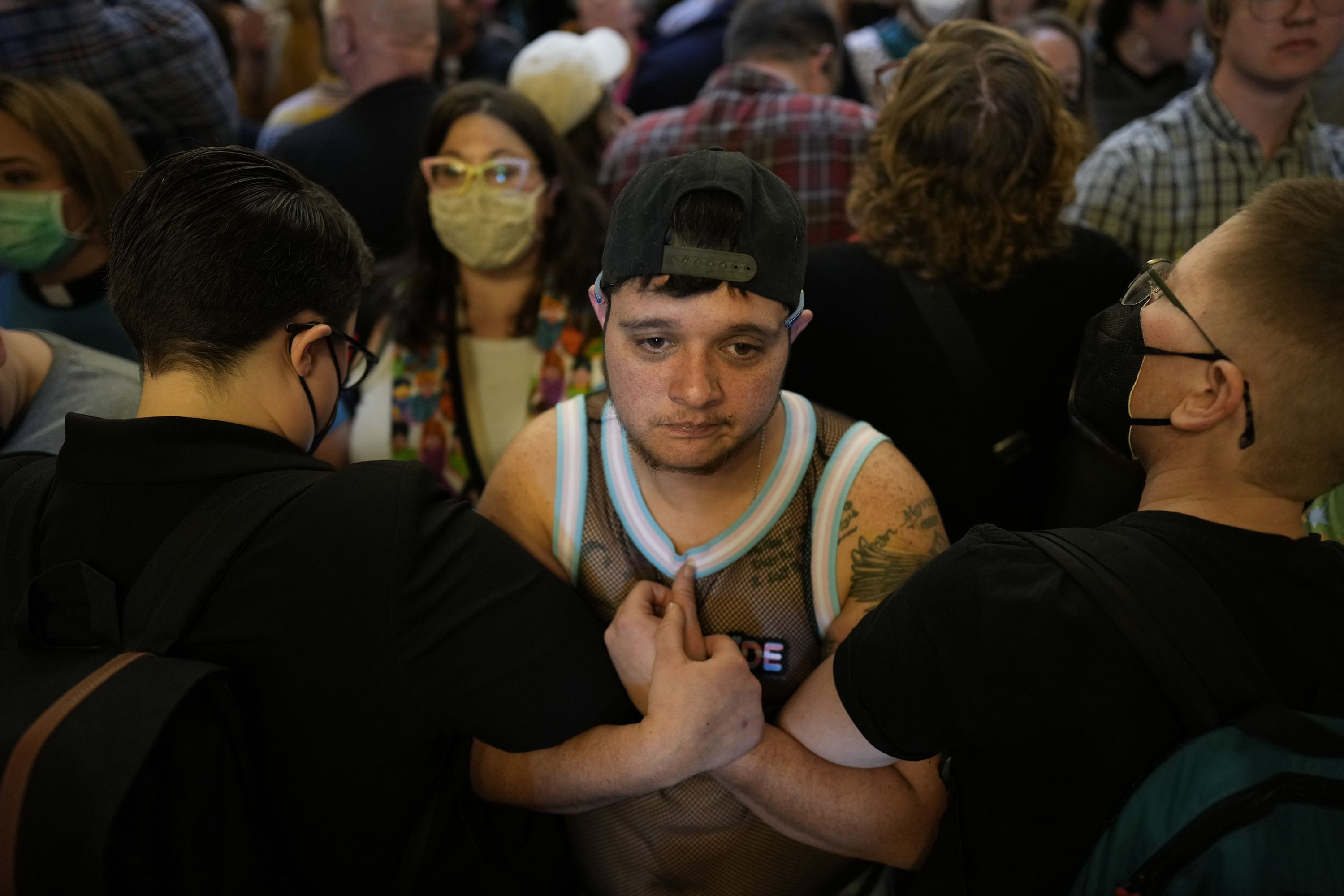 Protesters fill the Iowa state Capitol to denounce a bill that would strip the state civil rights code of protections based on gender identity, Thursday, February 27, 2025, in Des Moines, Iowa. (Photo by Charlie Neibergall/AP Photo)