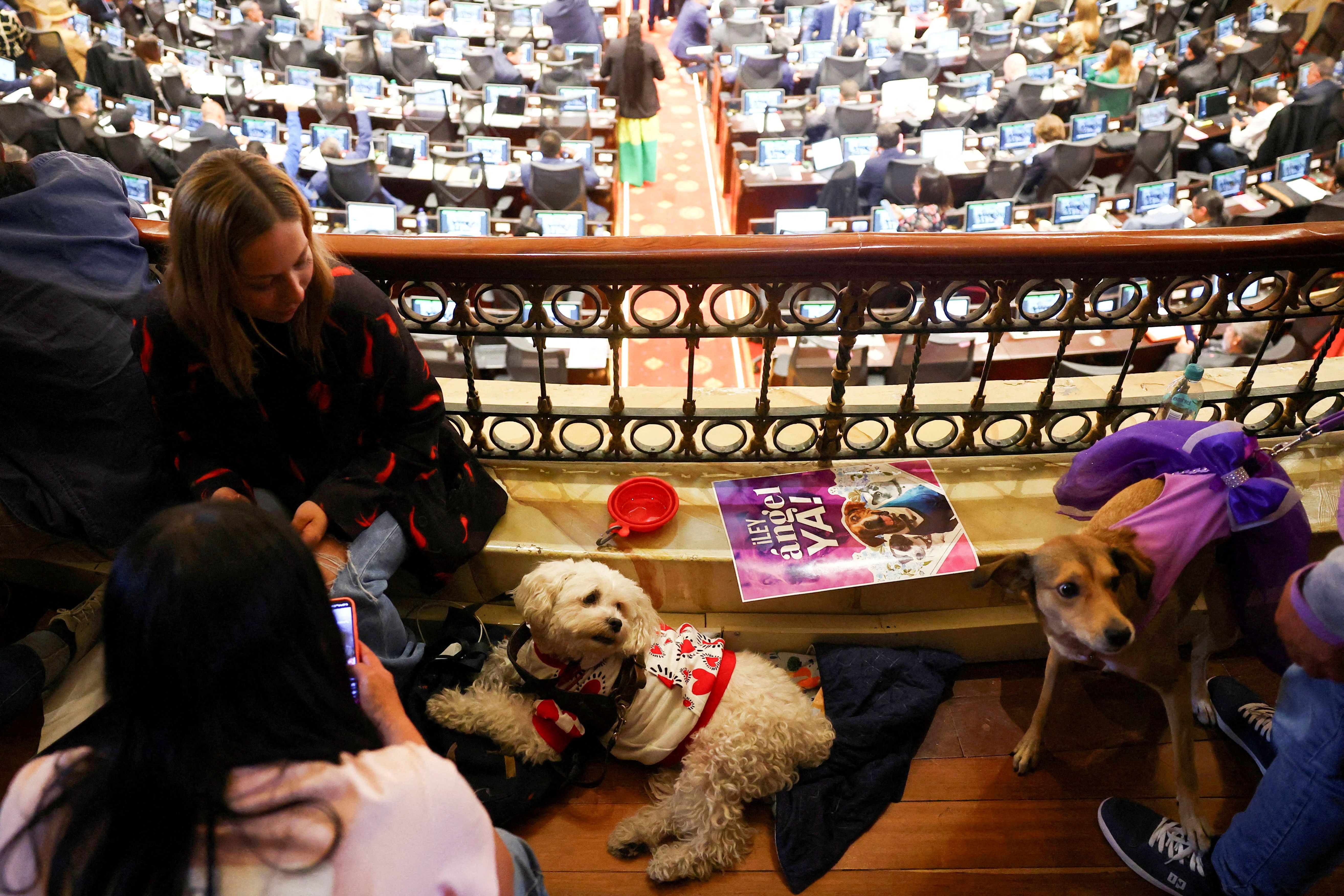 Dogs of animal activists are seen during the discussion of the “Angel” law that seeks harsher penalties against animal abuse in the Colombian congress, in Bogota, Colombia on February 25, 2025. (Photo by Luisa Gonzalez/Reuters)