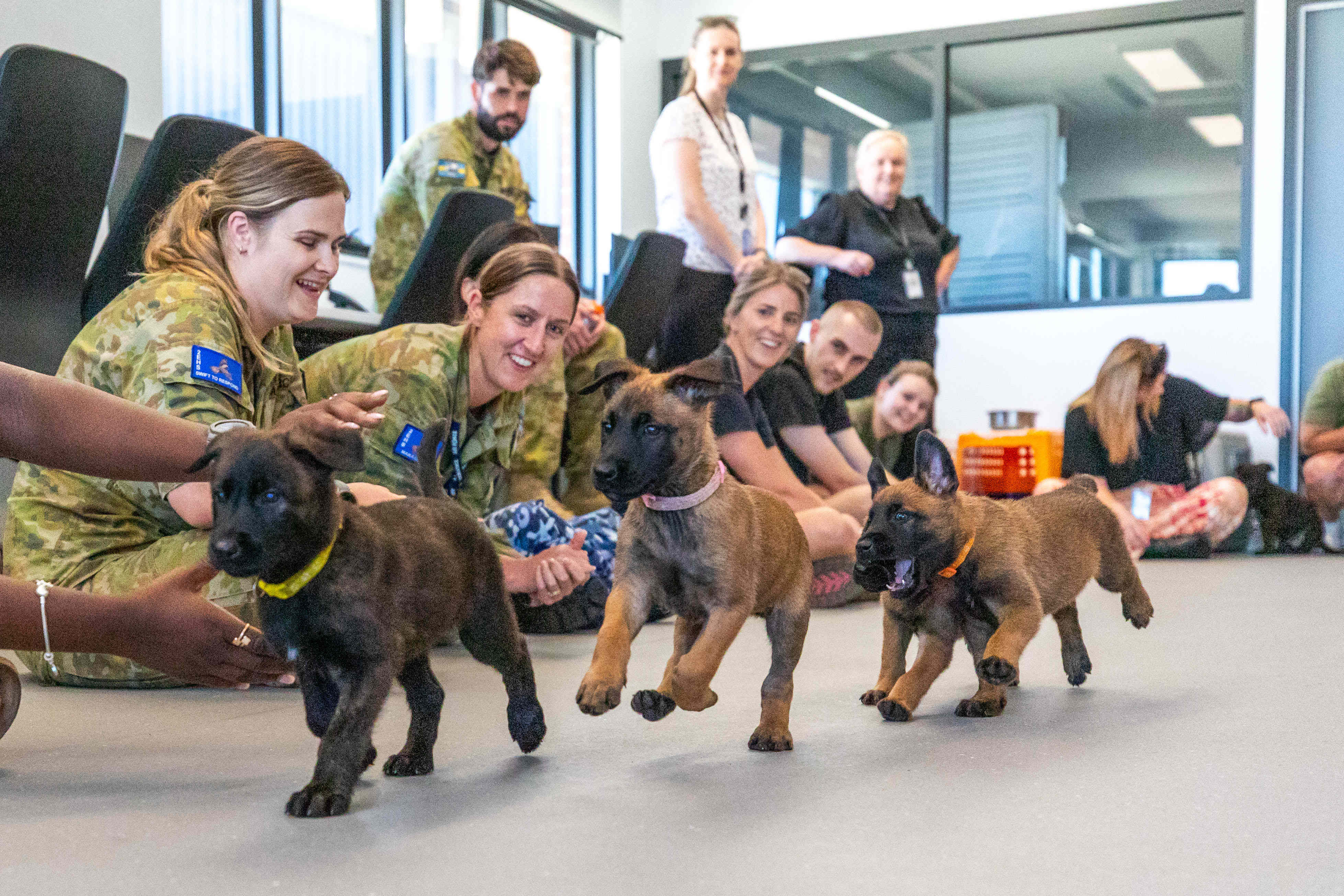 Seven-week-old Belgian Malinois puppies visited Royal Australian Air Force Base Pearce, Perth on March 3, 2025, to meet personnel they may one day work alongside. The puppies from K9 Solutions Australia's Virtus House Kennel enjoyed some well-deserved pats and a play. (Photo by Michael Thomas/Royal Australian Air Force/Capture Media Agency)
