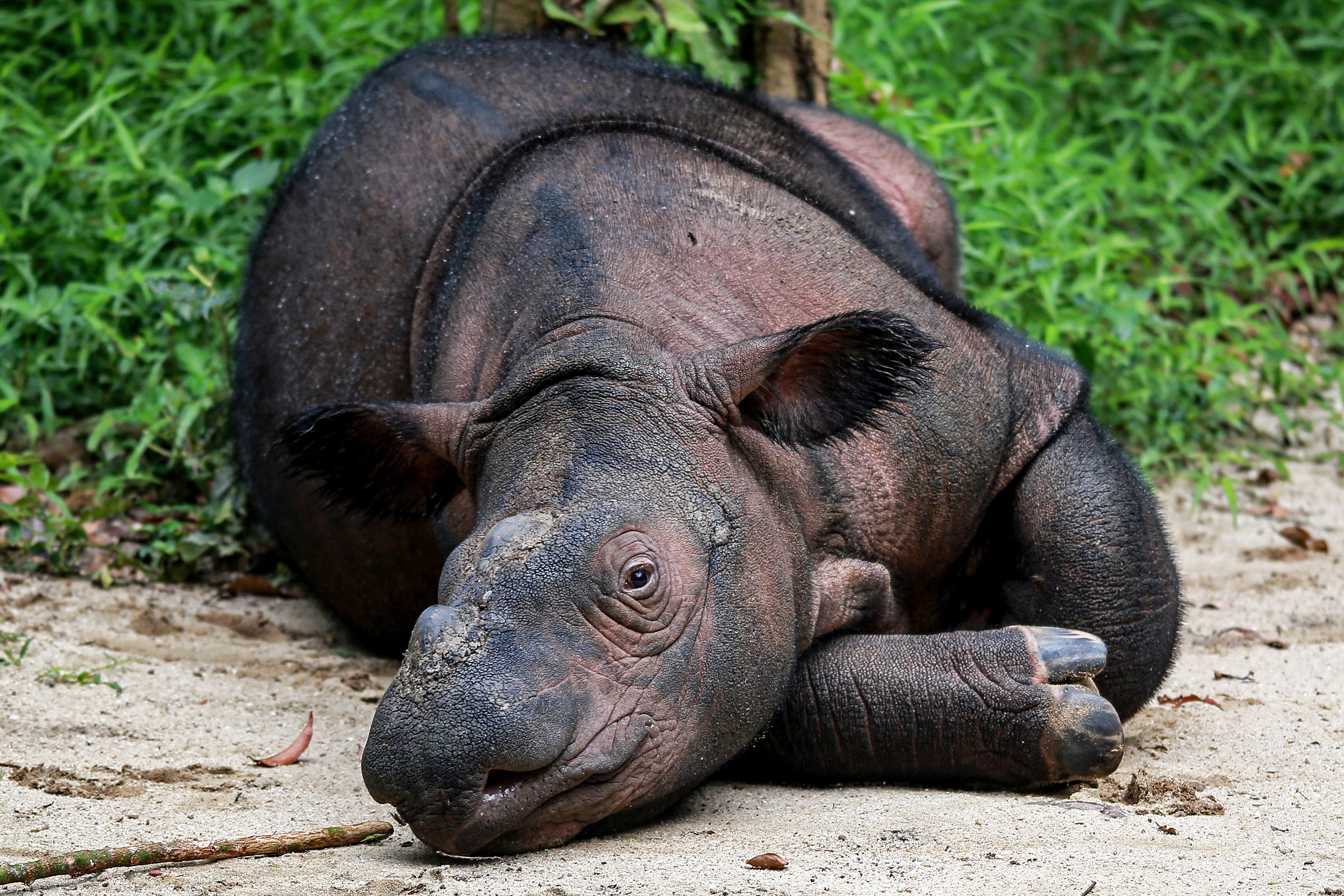 Indra, a one-year-old male Sumatran rhinoceros rests at the Sumatran Rhino Sanctuary (SRS) in Way Kambas National Park, Lampung province on February 16, 2025. (Photo by Perdiansyah/AFP)