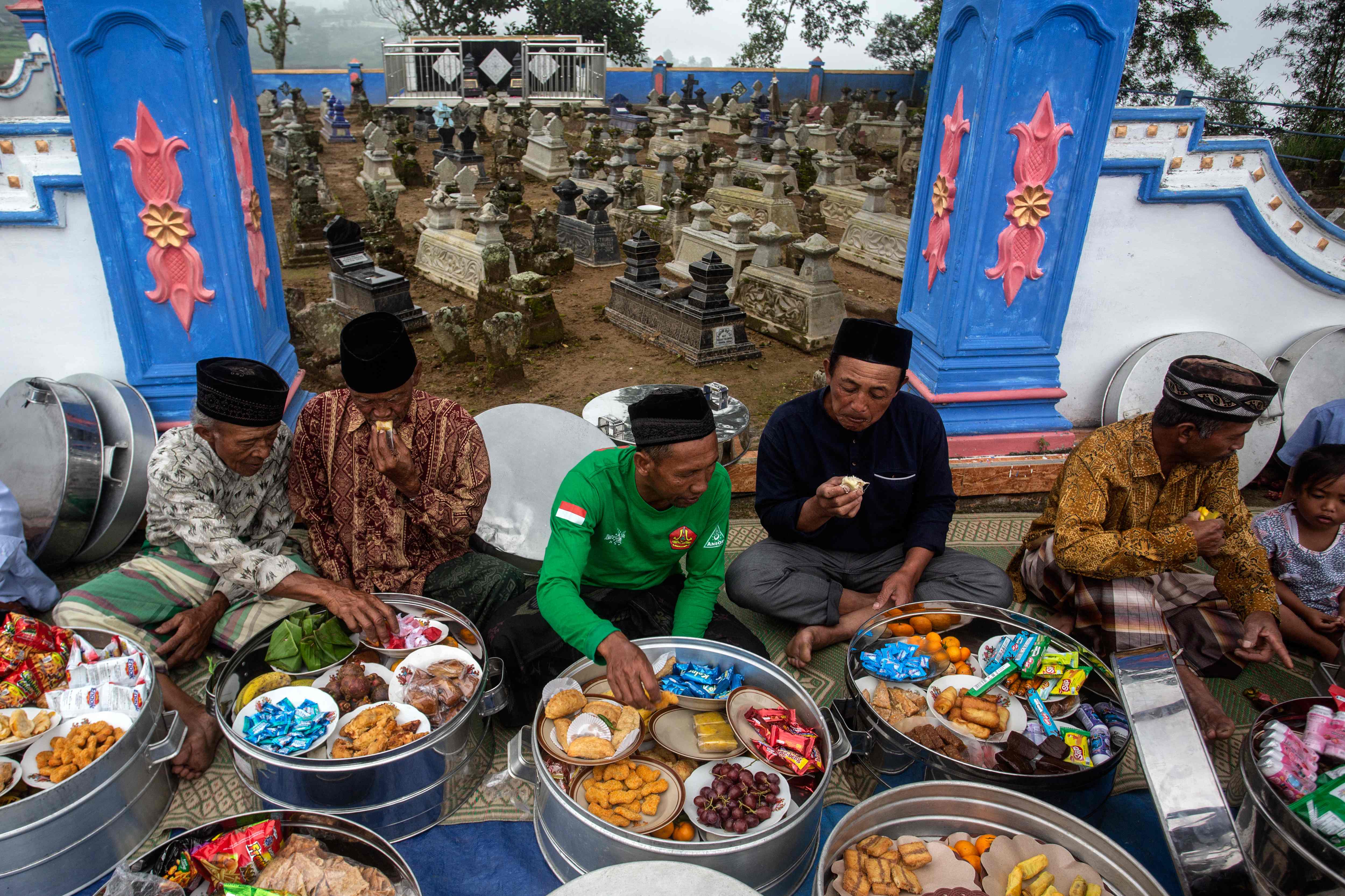 Muslims eat together during the Nyadran ritual, a tradition where people come together to pray for their ancestors before the holy month of Ramadan, in front of a cemetery in Boyolali, Central Java, on February 17, 2025. (Photo by Devi Rahman/AFP Photo)
