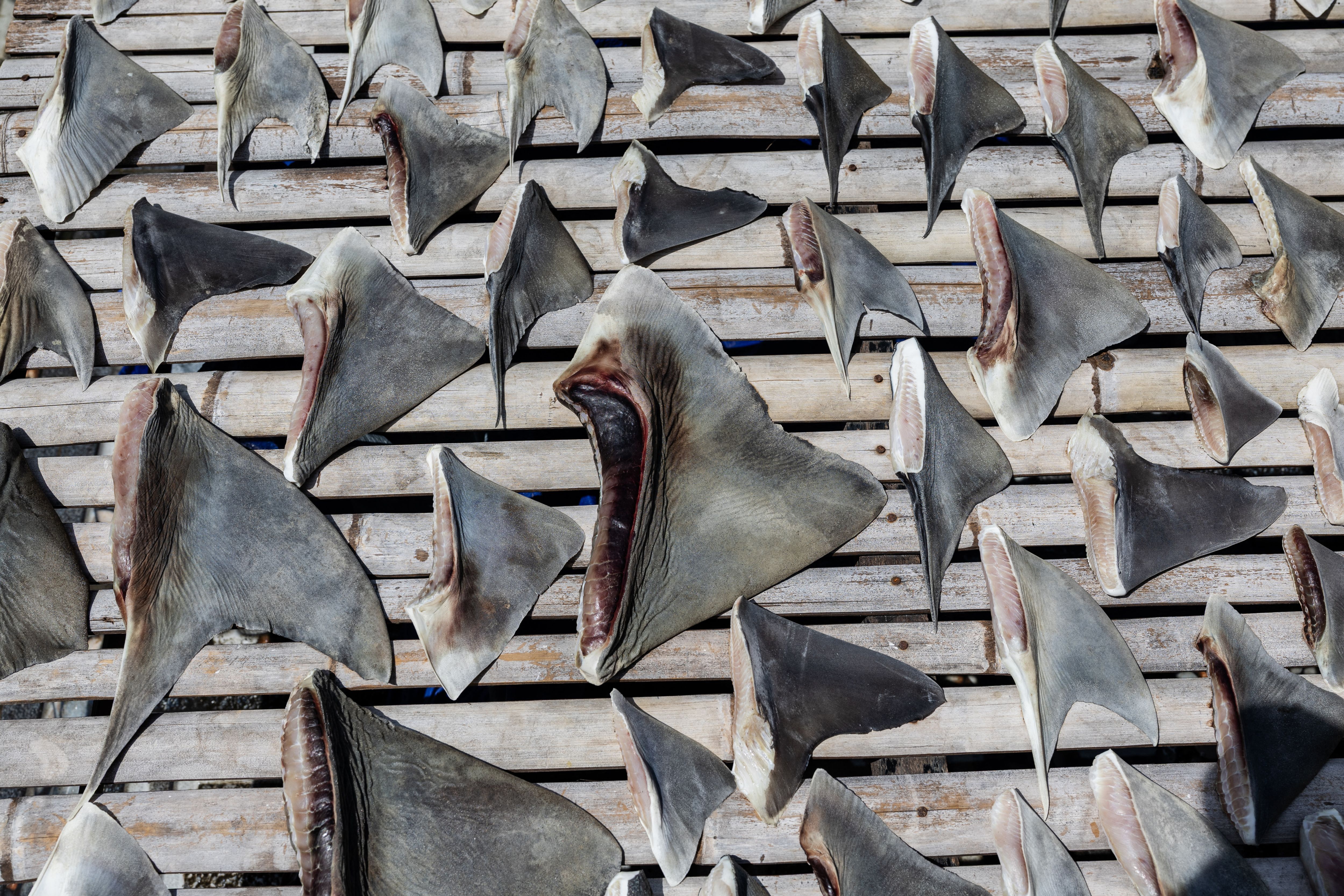 This photograph shows shark fins placed for drying near a traditional fish market in Tanjung Luar, Lombok Island, West Nusa Tenggara, on February 21, 2025. (Photo by Garry Lotulung/AFP Photo)