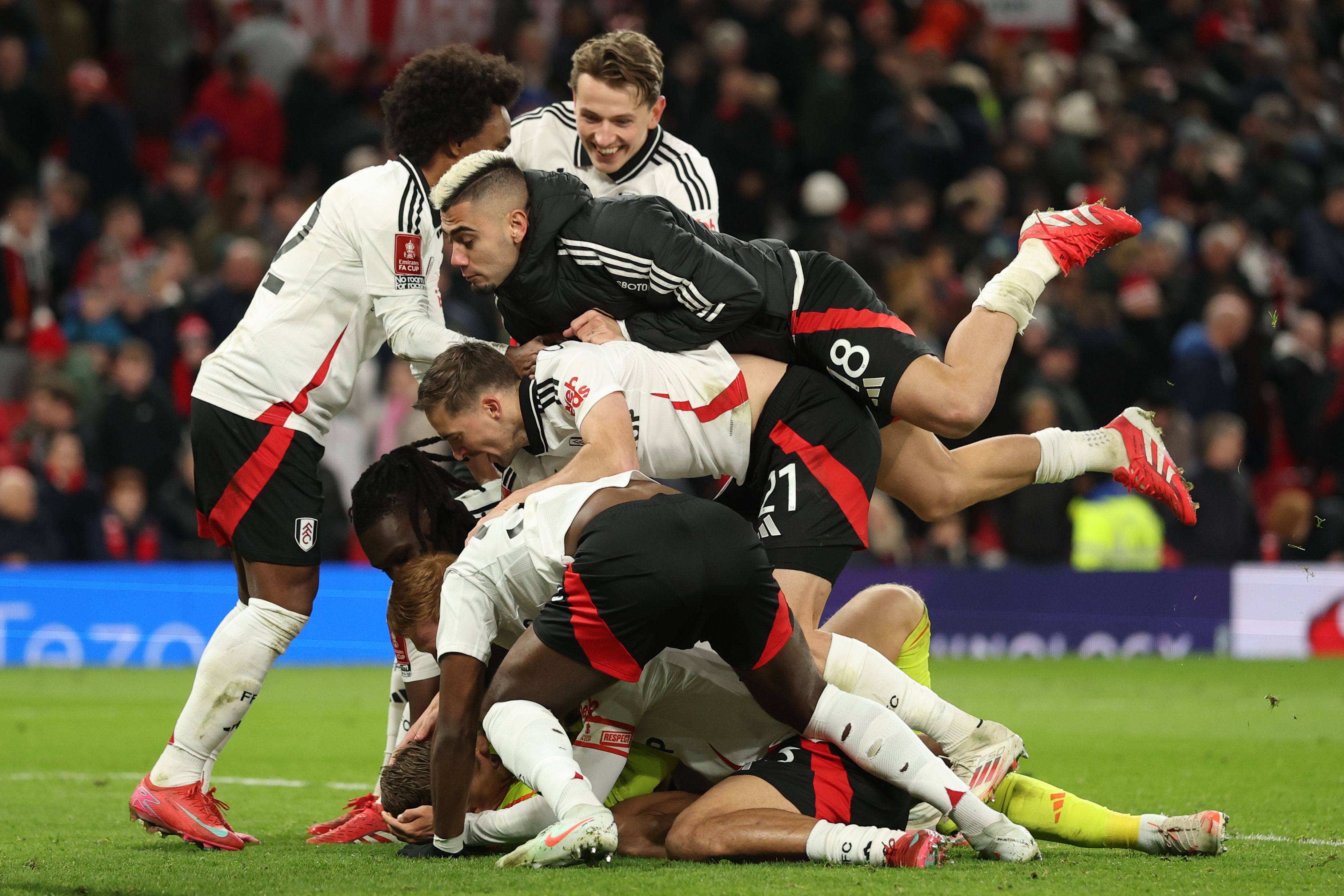 Fulham celebrate winning the penalty shoot out Manchester United v Fulham, Emirates FA Cup, Fifth Round, Football, Old Trafford, Manchester, UK on March 2, 2025. (Photo by Paul Currie/Rex Features/Shutterstock)