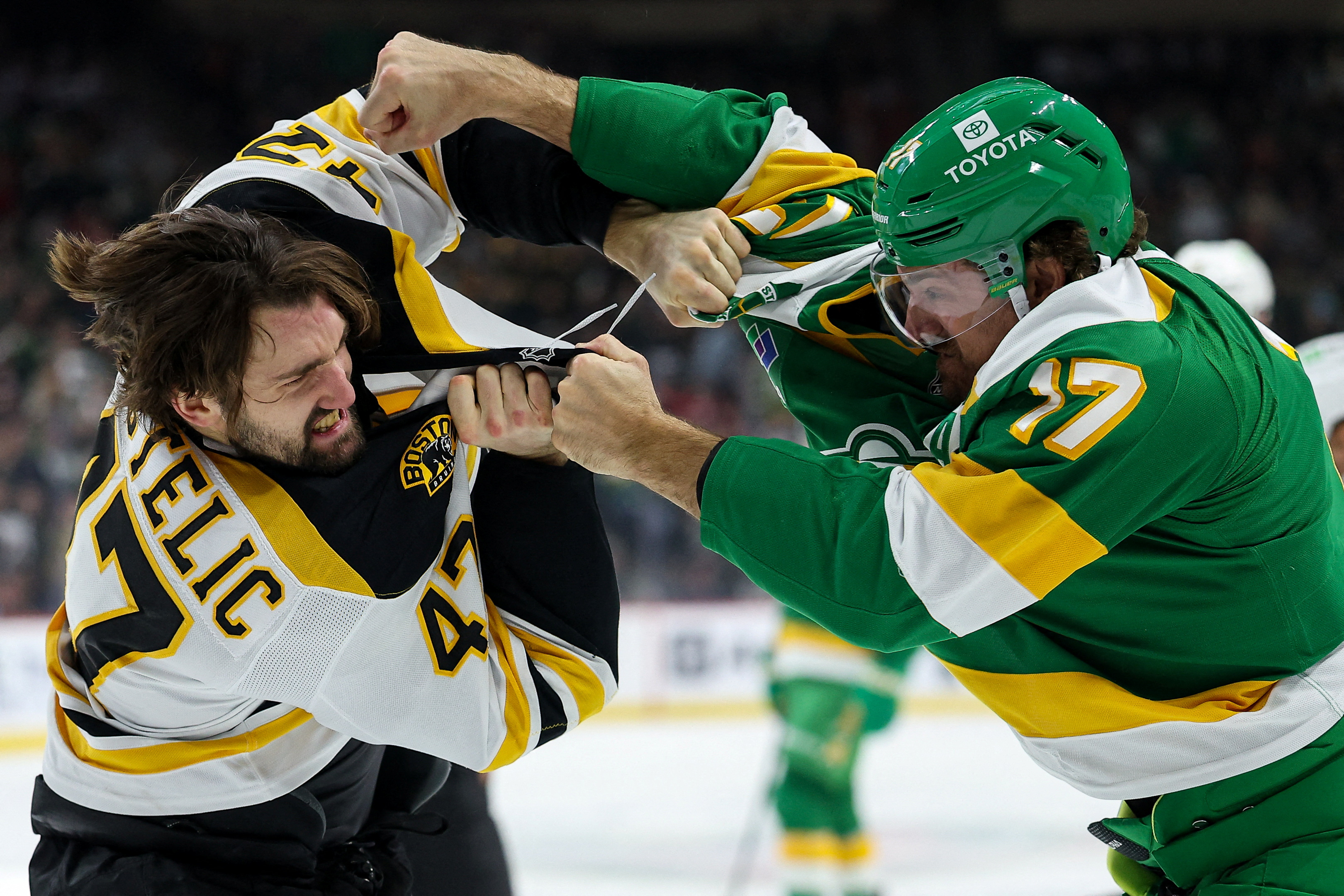 Boston Bruins center Mark Kastelic (47) and Minnesota Wild left wing Marcus Foligno (17) fight during the first period at Xcel Energy Center in Saint Paul, Minnesota on March 2, 2025. (Photo by Matt Krohn/Reuters)