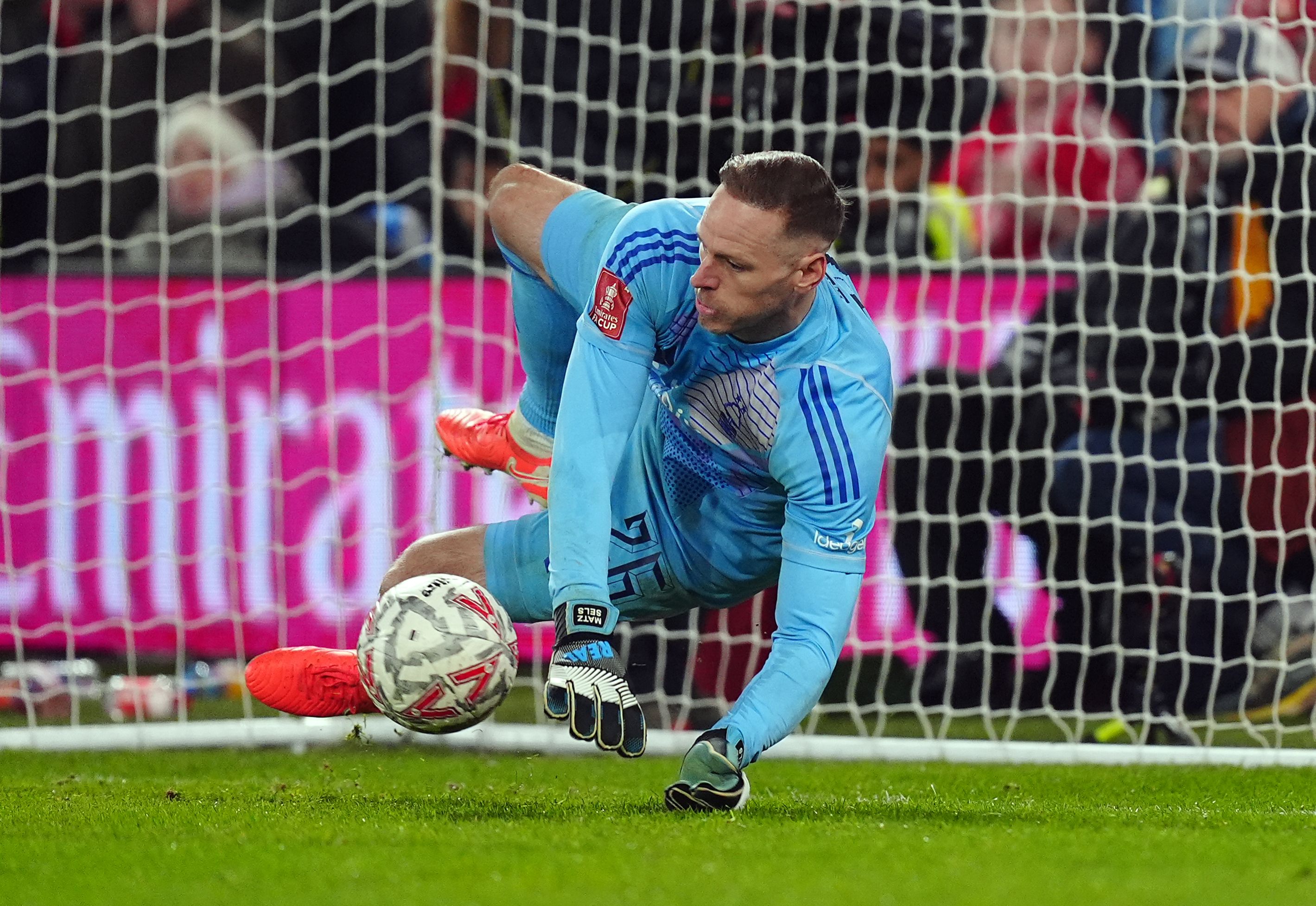 Nottingham Forest goalkeeper Matz Sels saves from Ipswich Town's Jack Taylor (not pictured) to win the penalty shoot out during the Emirates FA Cup fifth round match at the City Ground, Nottingham on Monday, March 3, 2025. (Photo by Mike Egerton/PA Wire)