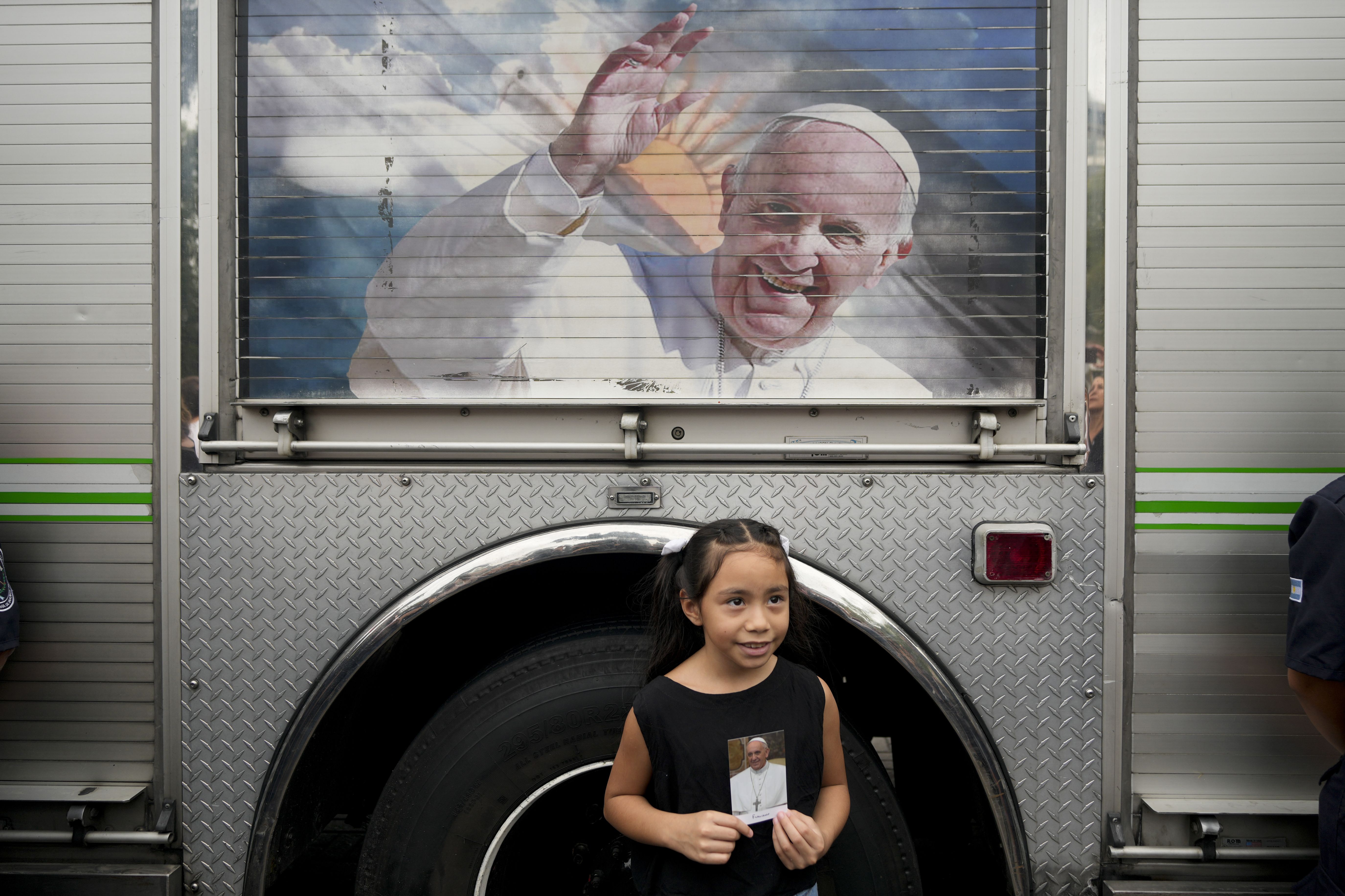 Valentina Fernandez poses for a picture holding an image of Pope Francis after a Mass to pray for his health at Constitution Square in Buenos Aires, Argentina, Monday, February 24, 2025. (Photo by Natacha Pisarenko/AP Photo)