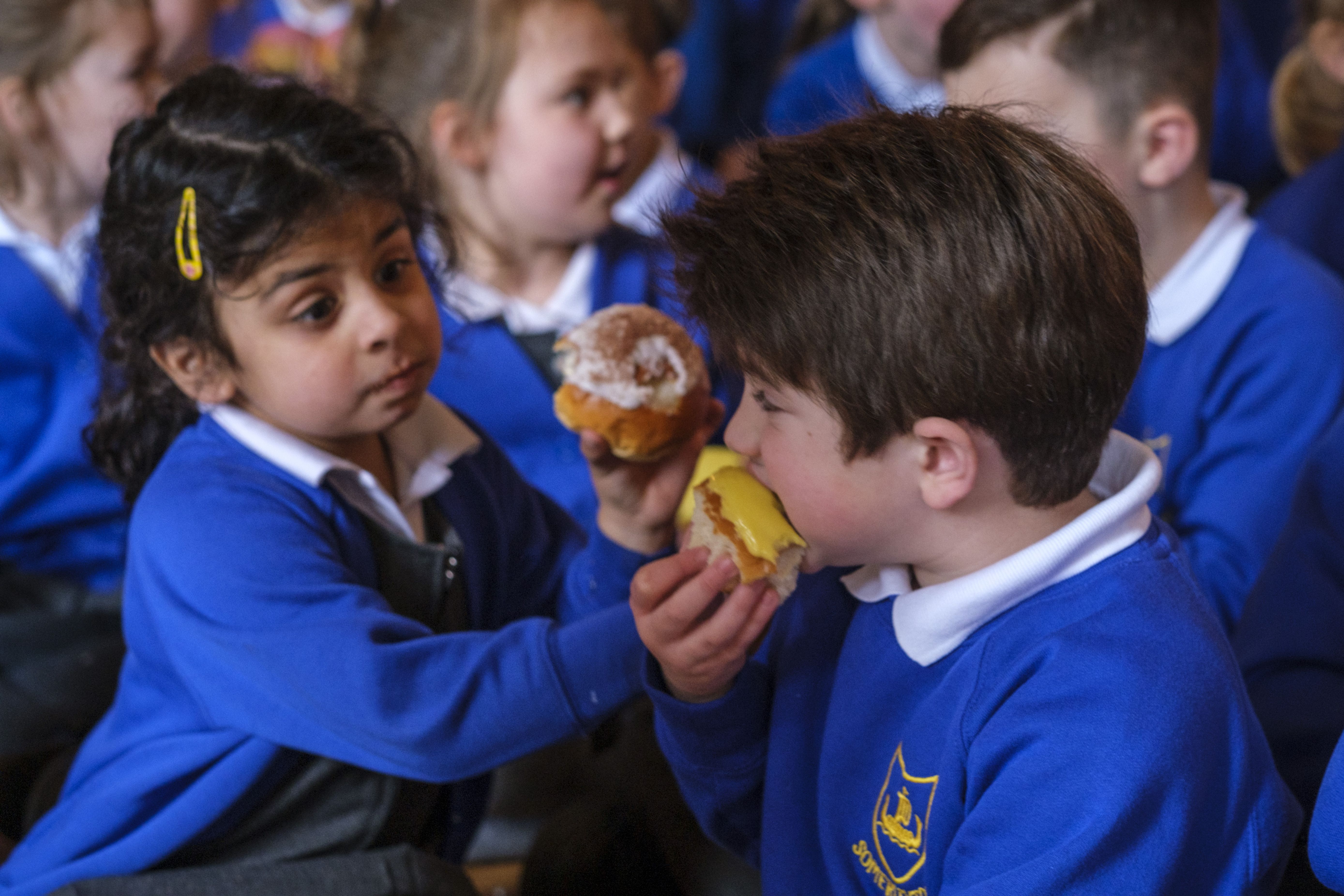 Children at Somerleyton School in Suffolk, UK on February 27, 2025 tuck into an iced bun, given by the Lord and Lady Somerleyton along with a £1 coin, as part of a long-standing tradition dating back to 1877". (Photo by Jason Bye for the Times)