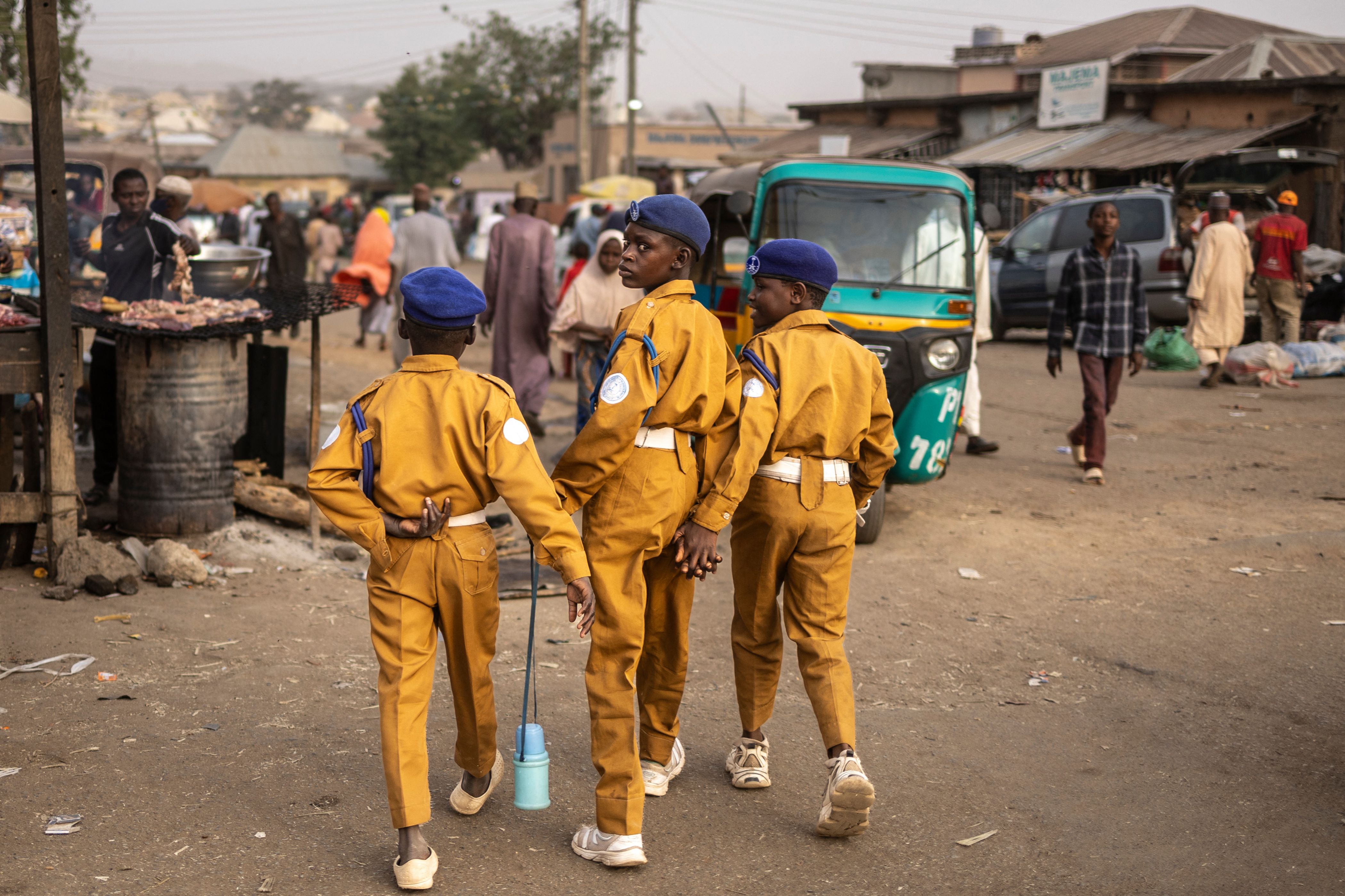 A boy looks back as he walks with other boys while wearing school uniforms in Jos, Nigeria, on February 27, 2025. (Photo by Olympia de Maismont/AFP Photo)
