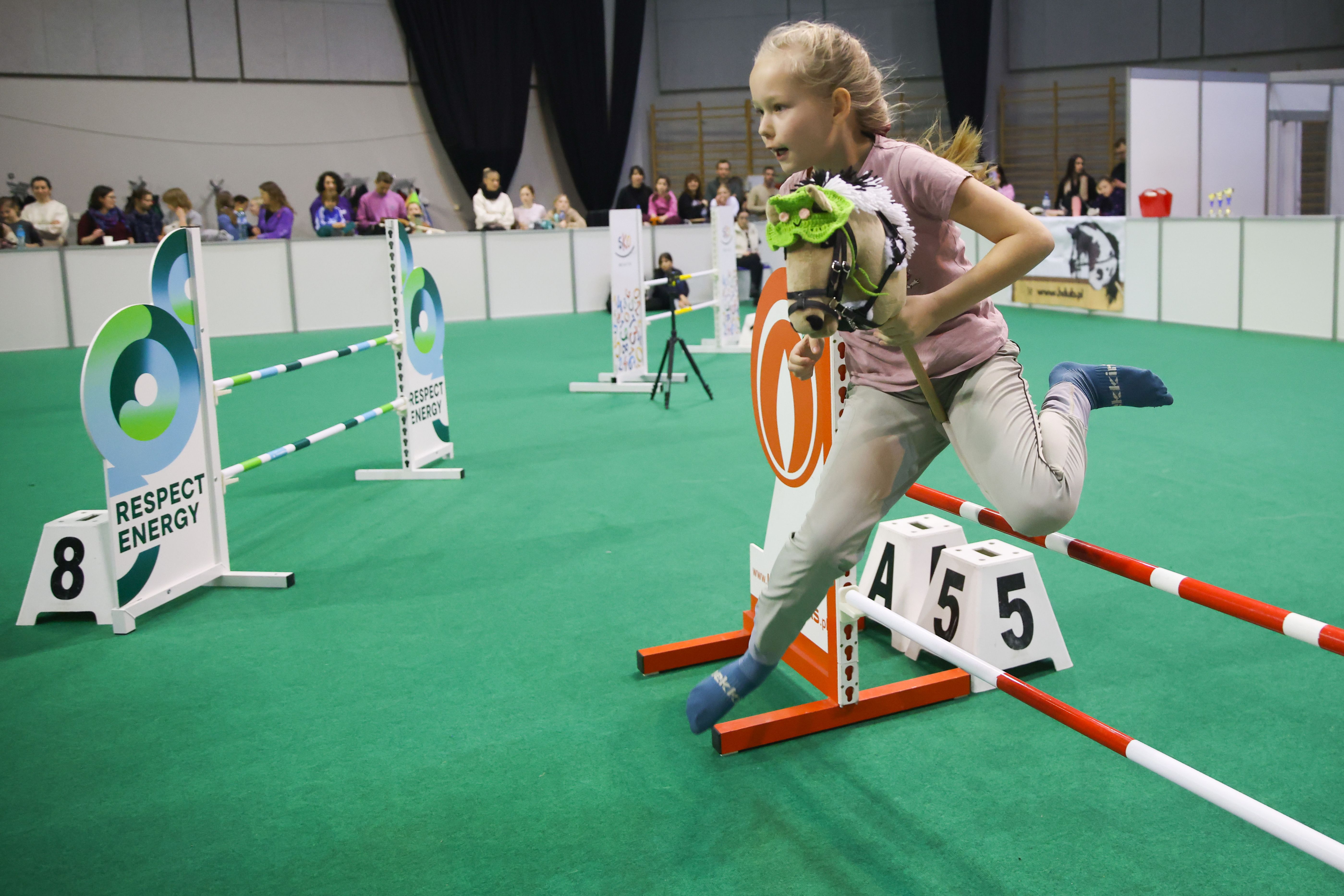 A competitor jumps while taking part in Hobby Horse competition during Cavaliada Tour, the largest series of indoor equestrian competitions in Poland, held at TAURON Arena venue in Krakow, on February 23rd, 2025. (Photo by Beata Zawrzel/NurPhoto/Rex Features/Shutterstock)
