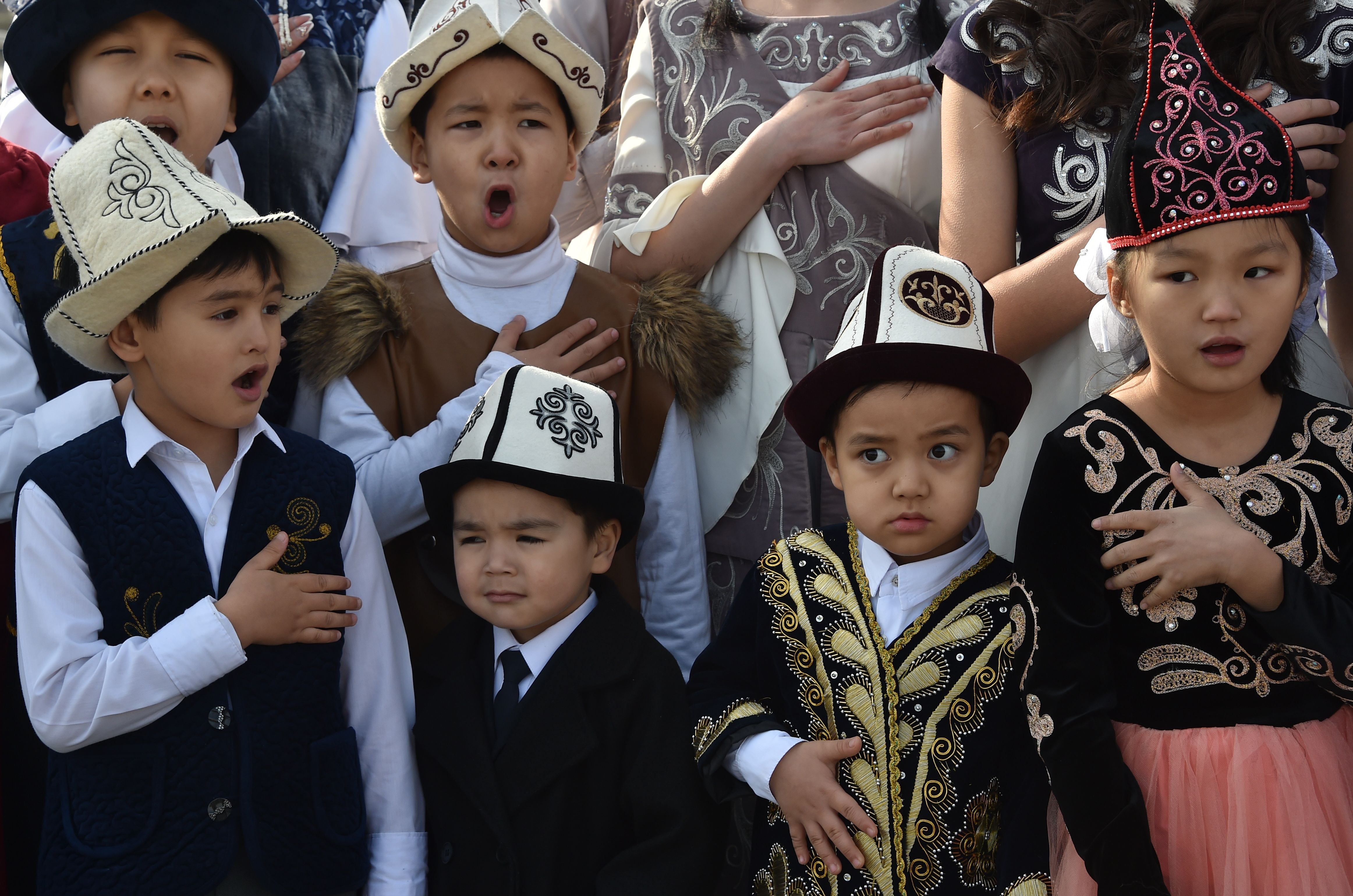 Children attend the celebrations marking the National Flag Day and the Day of Kyrgyz national “Ak-kalpak” hat at the central Ala-Too Square in Bishkek on March 4, 2021. (Photo by Vyacheslav Oseledko/AFP Photo)