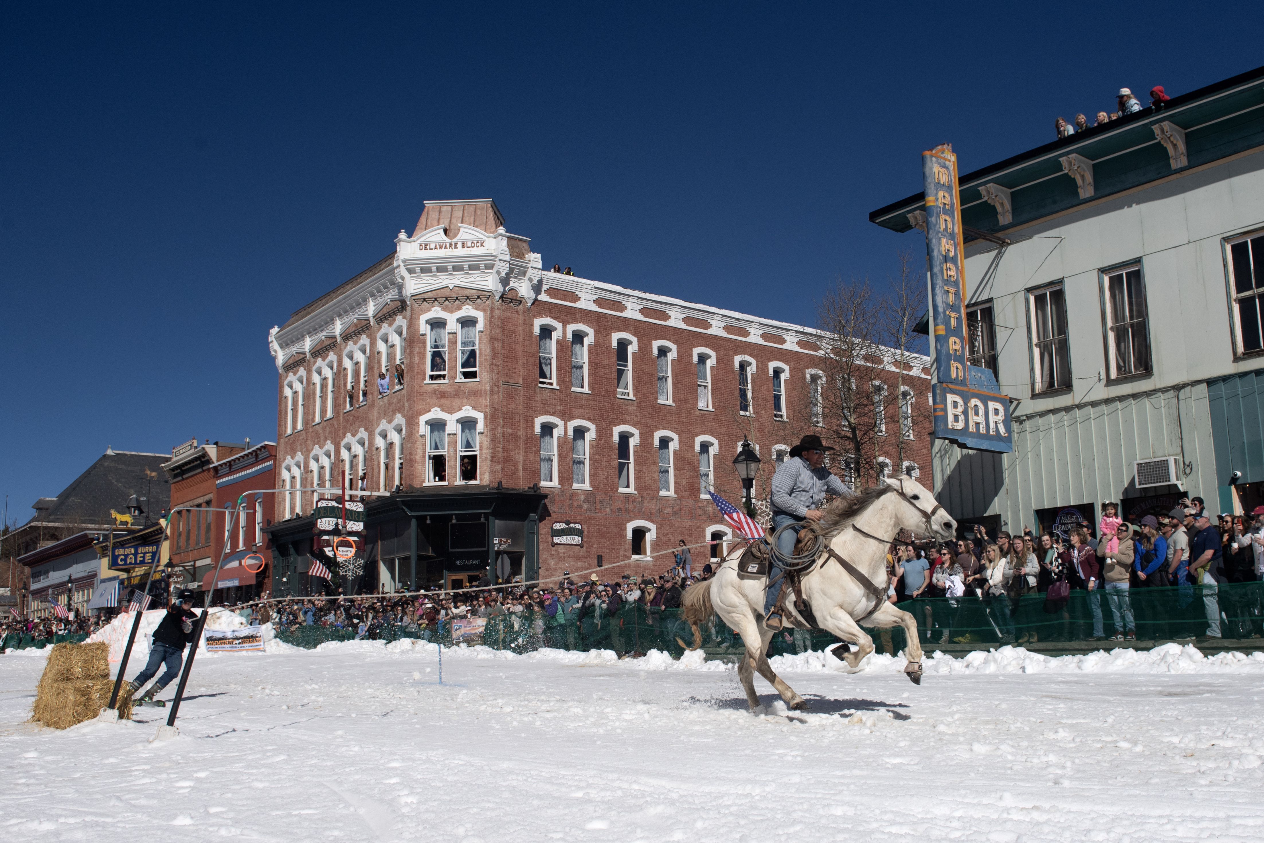A rider and skier race down Harrison Avenue during the 77th annual Leadville Ski Joring weekend competition in Leadville, Colorado, on March 1, 2025. Skijoring, which has its origins as a competitive sport in Scandinavia, has been adapted over the years to include a team made up of a rider and skier who must navigate jumps, slalom gates and the spearing of rings for points. Leadville, with an elevation of 10,152 feet (3,094 m), the highest incorporated city in North America, has been hosting skijoring competitions since 1949. (Photo by Jason Connolly/AFP Photo)