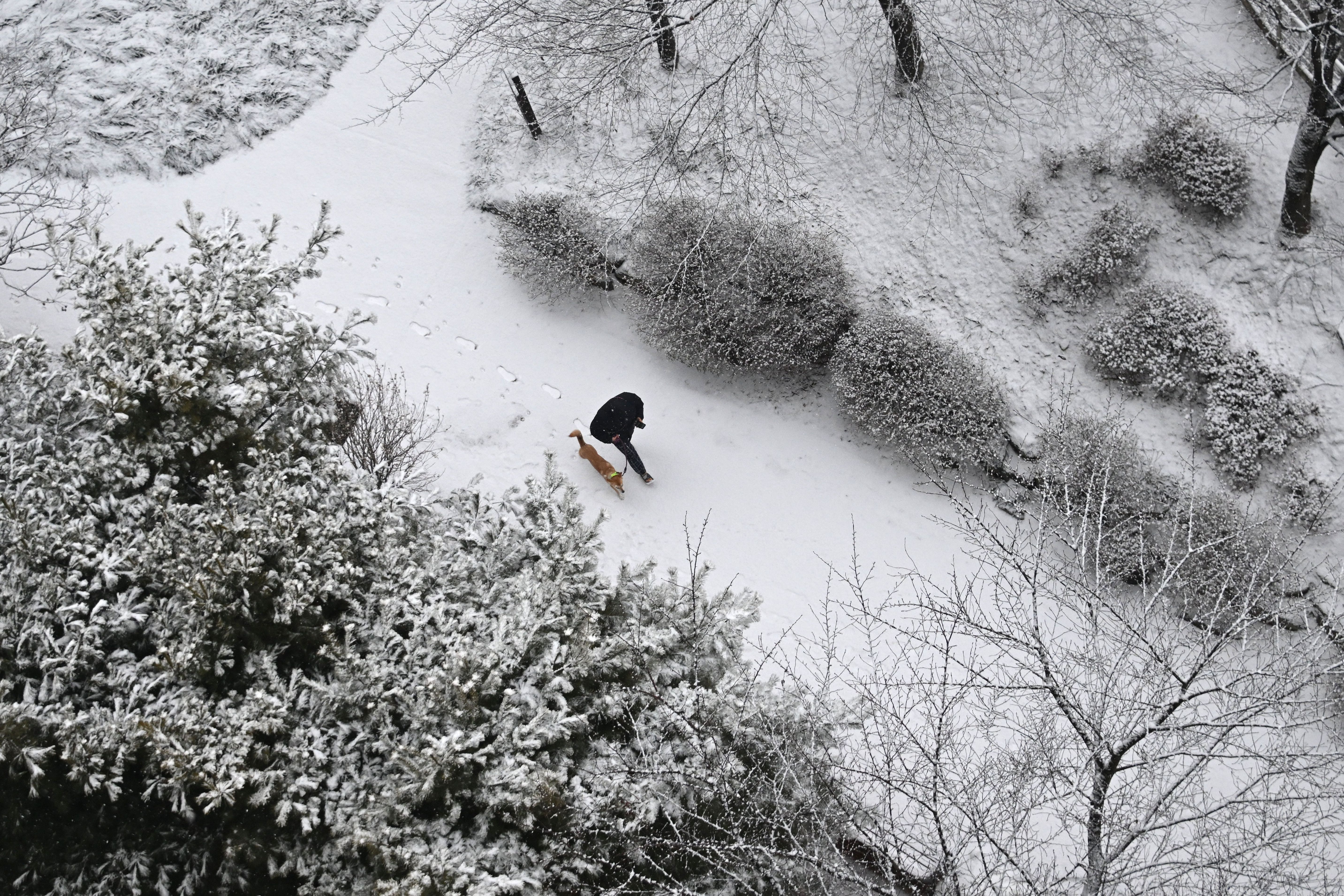 A man walks with his dog through a snow-covered park during snowfall in Goyang, northwest of Seoul, on February 12, 2025. (Photo by Jung Yeon-je/AFP Photo)