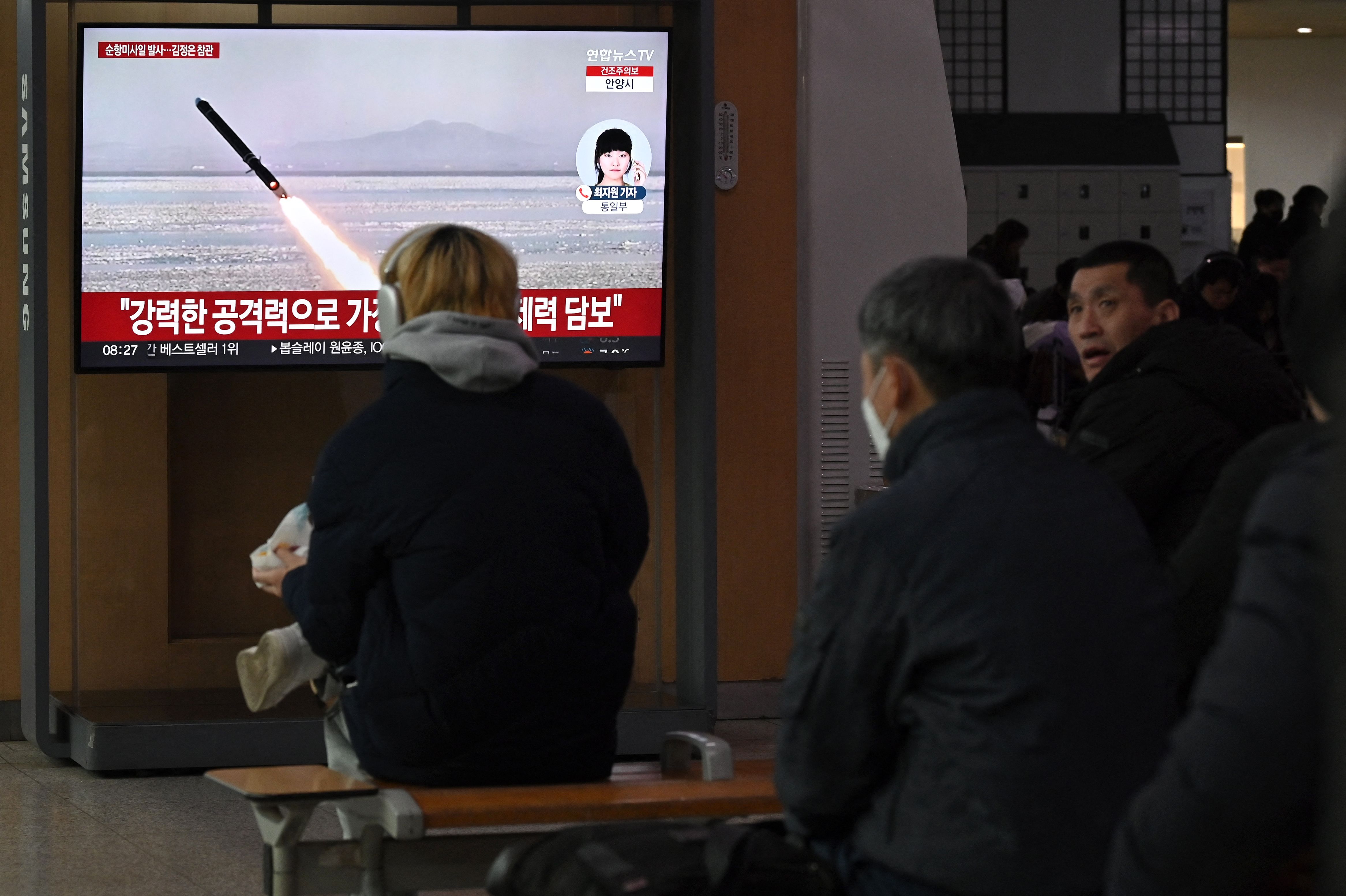 People watch a television screen showing news footage of North Korea's latest test-launch of strategic cruise missiles, at a train station in Seoul on February 28, 2025. North Korea conducted a “strategic cruise missile launching drill” in the Yellow Sea this week, Pyongyang's state media reported on February 28, saying the exercise sought to demonstrate the prowess of its “state nuclear deterrence”. (Photo by Jung Yeon-je/AFP Photo)