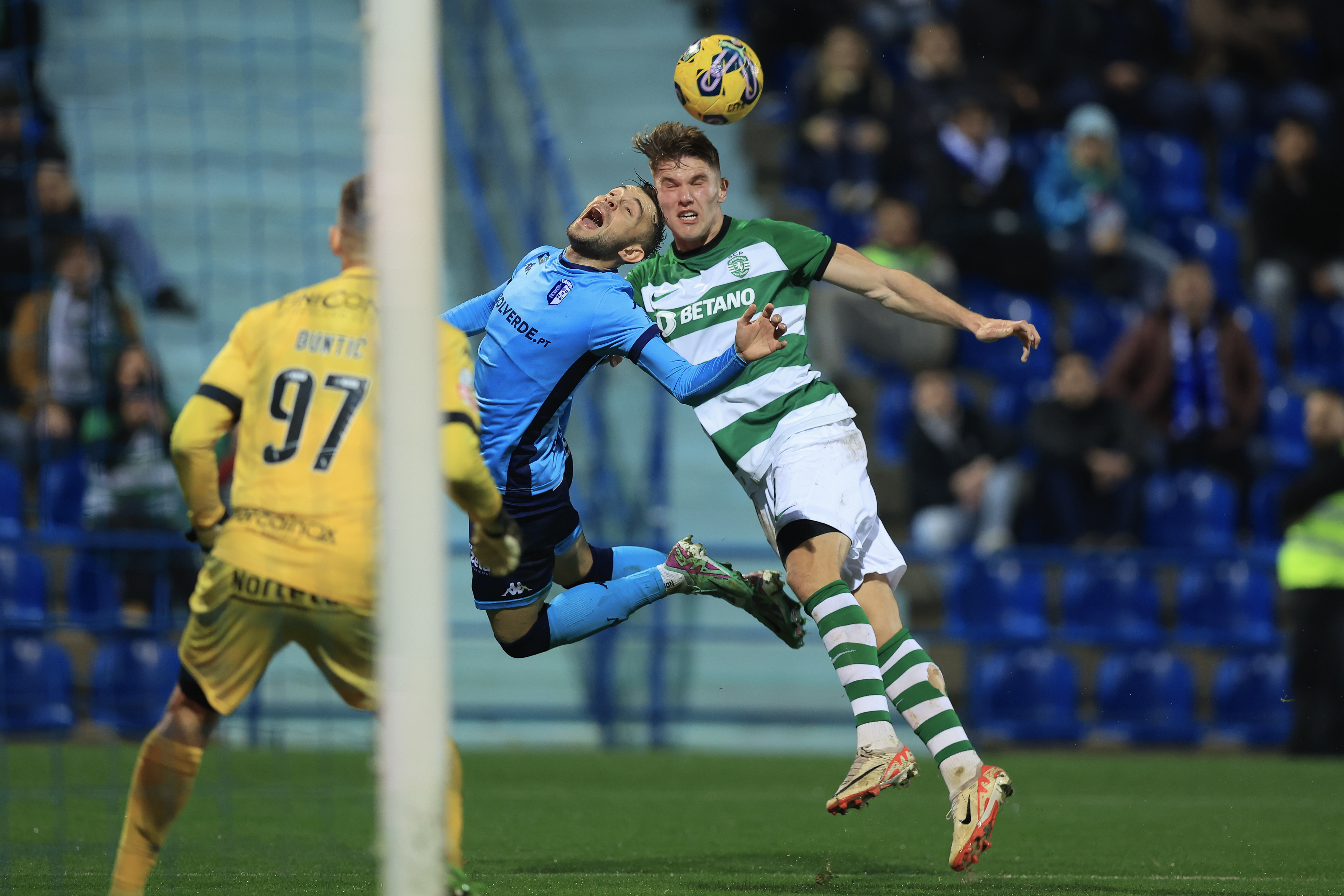 Vizela's Orest Lebedenko (C) in action against Sporting's Gyokeres (R) during their First League soccer match held at Vizela Municipal stadium, Vizela, north of Portugal, 18 January 2024. (Photo by Jose Coelho/LUSA)