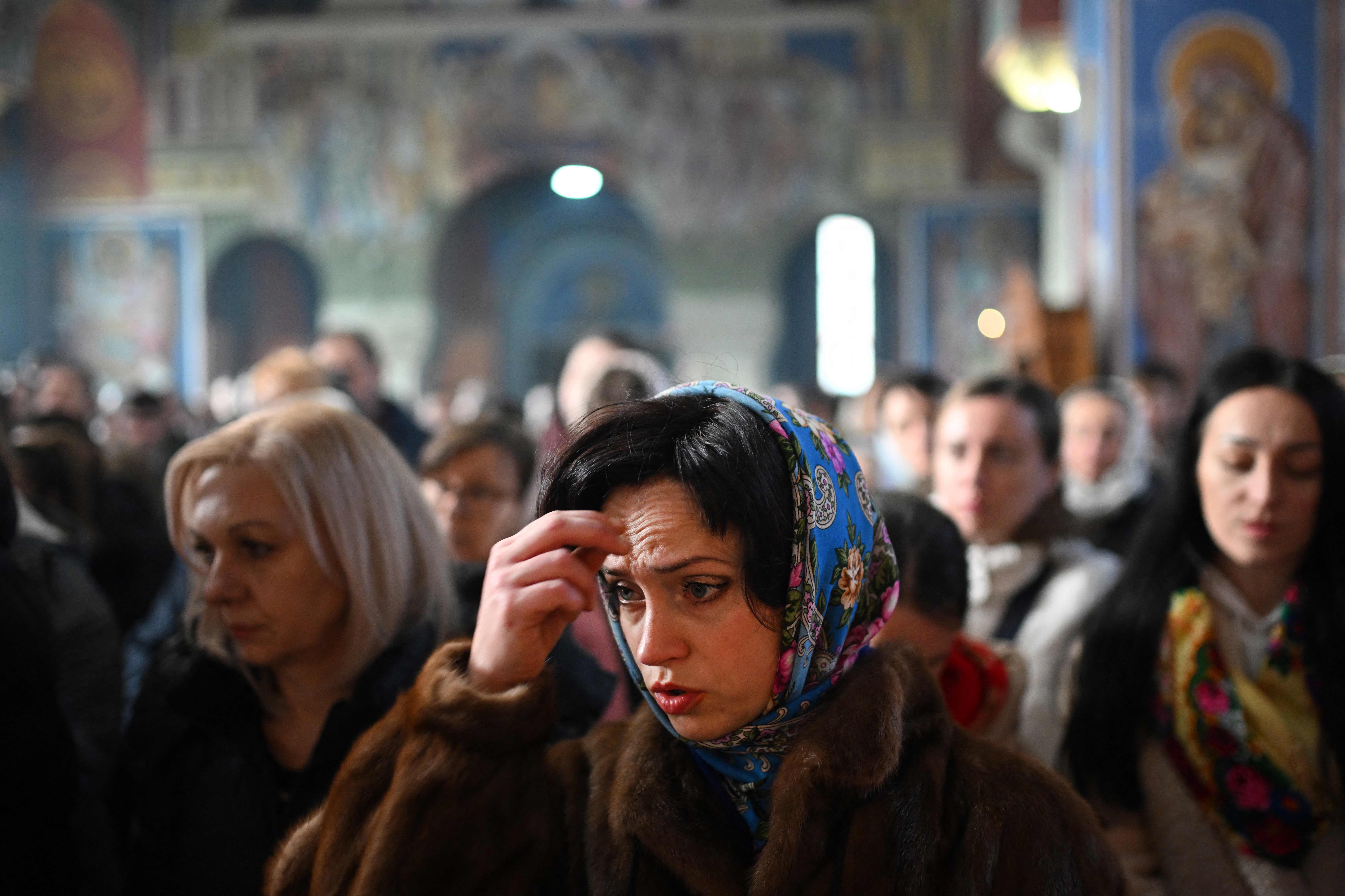Members of the congregation pray during a service of the Nativity of Christ Liturgy at the Serbian Orthodox Church of the Holy Prince Lazar in Bournville, Birmingham, central England on January 7, 2024. Orthodox Christians celebrate Christmas according to the Julian calendar where Christmas Day falls on January 7. The Lazarica church, dedicated to the Holy Prince Lazar, is the first purpose-built Serbian Orthodox church constructed in the UK and is decorated in a 14th Century Byzantine-Morava artistic style. (Photo by Oli Scarff/AFP Photo)