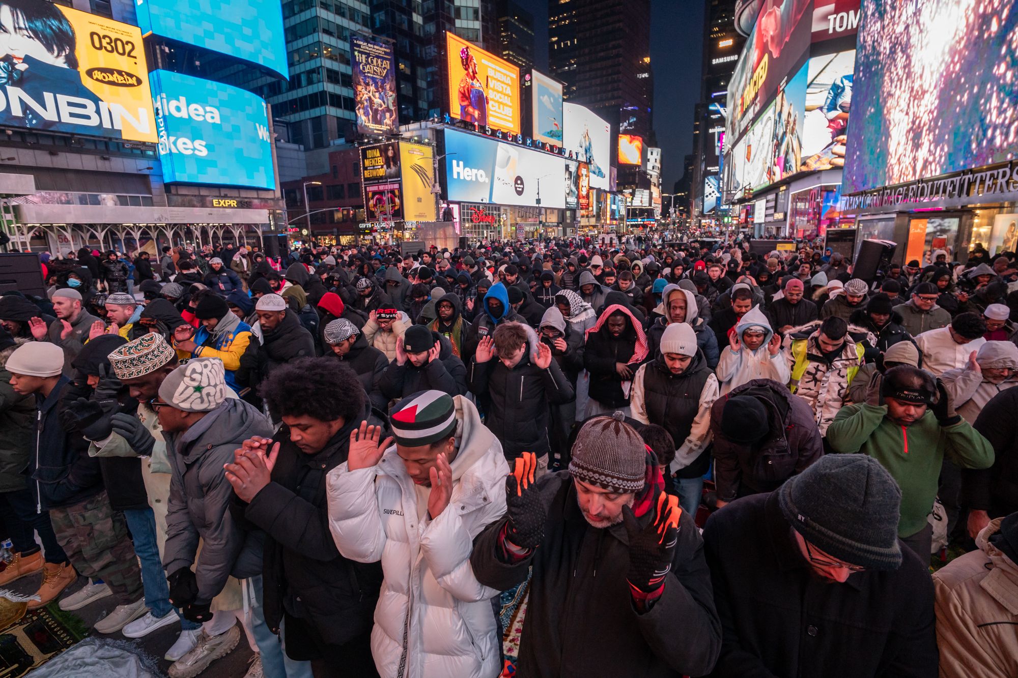 Members of the Muslim community perform Maghrib prayer during Ramadan in Times Square, New York City, on March 02, 2025. (Photo by Adam Gray/AFP Photo)