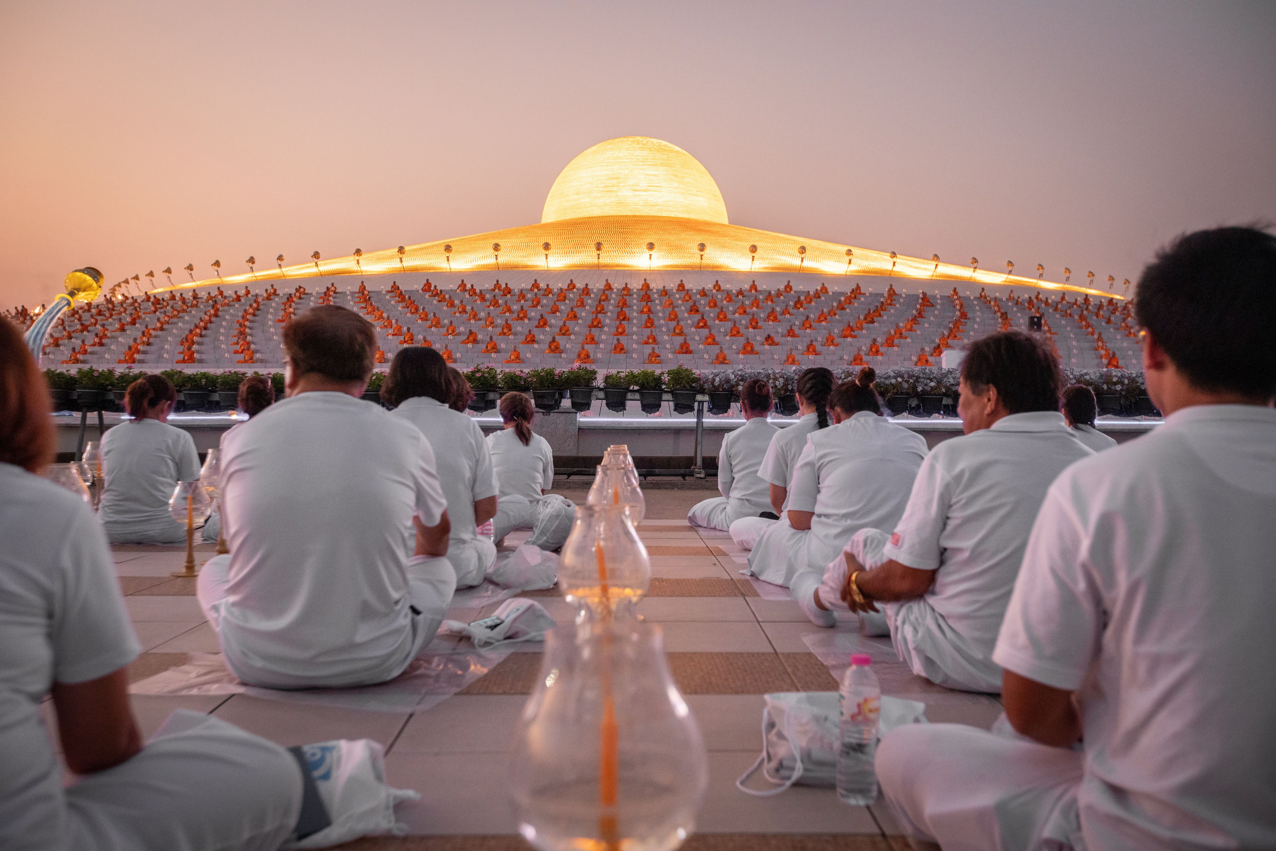Devotees pray during the yearly ceremony of Makha Bucha at Wat Dhammakaya in the north of Bangkok on February 12, 2025. Thai people celebrate the Buddhist festival of clockwise circumambulation and Makha Bucha lantern lighting ceremony at Dhammakaya Temple on 'Makha Bucha Day' during the third lunar moon, where around 1250 monks gathered to be ordained by the Buddha and 35000 devotees holding lanterns. (Photo by Guillaume Payen/SOPA Images/Rex Features/Shutterstock)
