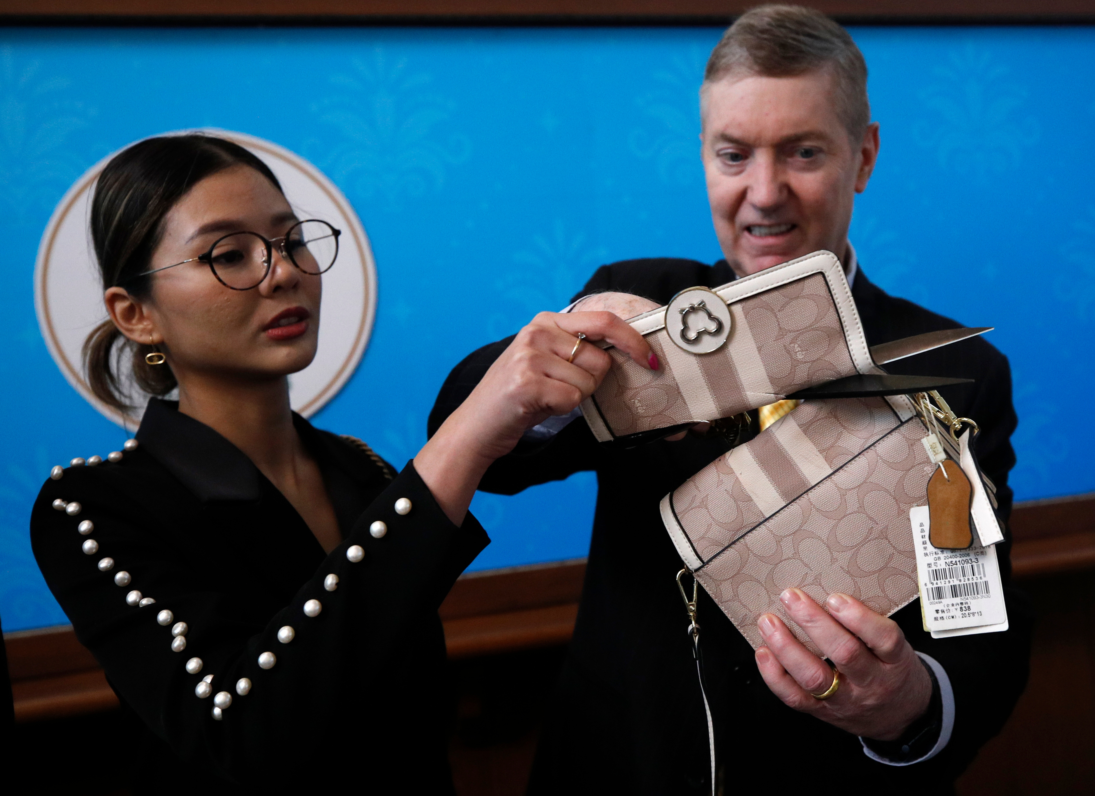 Representatives of trademark owners use scissors to cut and destroy seized counterfeit luxury fashion items during an intellectual property rights infringement goods destruction press conference at the Customs Department in Bangkok, Thailand, 18 February 2025. According to the Thai Customs Department, 602,600 counterfeit and pirated goods worth 46 million baht (1.3 million euros), including clothes, handbags, and footwear, will be destroyed. These items were seized in raids to combat trademark infringement. (Photo by Rungroj Yongrit/EPA/EFE)