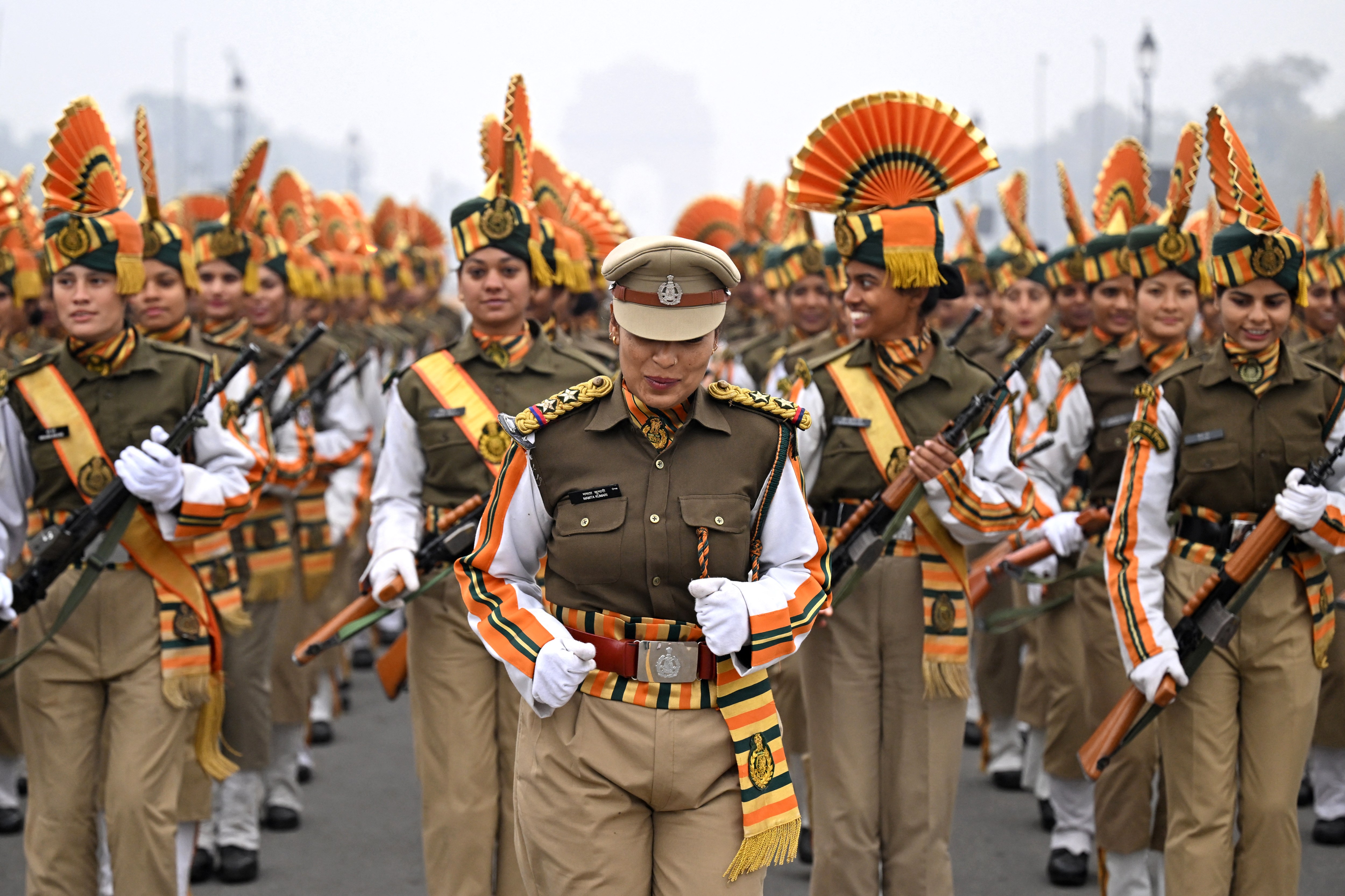 The Indo-Tibetan Border Police (ITBP) Force personnel warm up before taking part in a rehearsal for the upcoming Republic Day parade on a cold winter morning in New Delhi on January 4, 2024. (Photo by Money Sharma/AFP Photo)