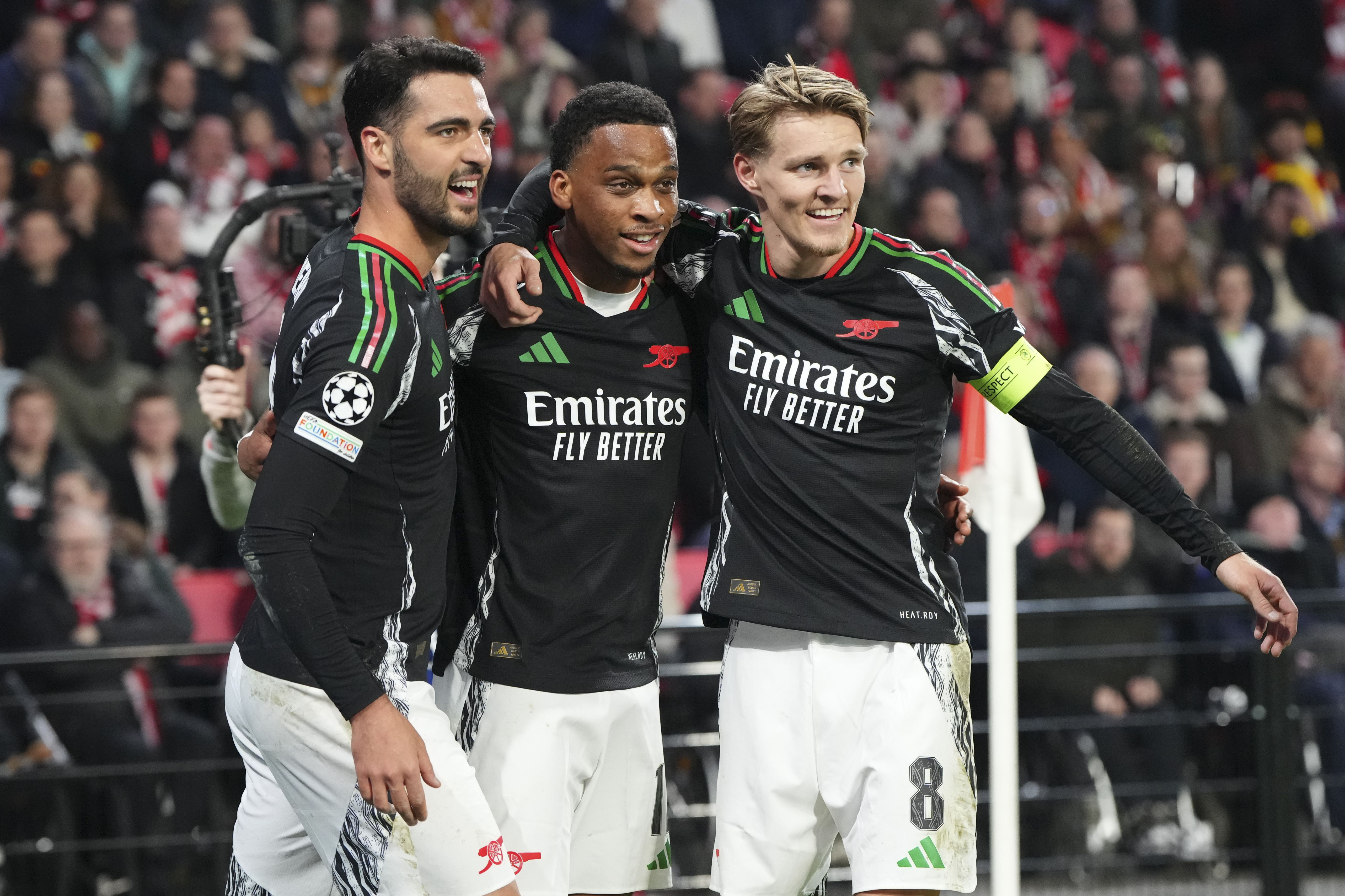 Arsenal's Jurrien Timber celebrates after scoring his side's first goal during the Champions League, round of 16, first leg soccer match between PSV and Arsenal at the Phillips Stadium in Eindhoven, Netherlands, Tuesday, March 4, 2025. (Photo by Peter Dejong/AP Photo)