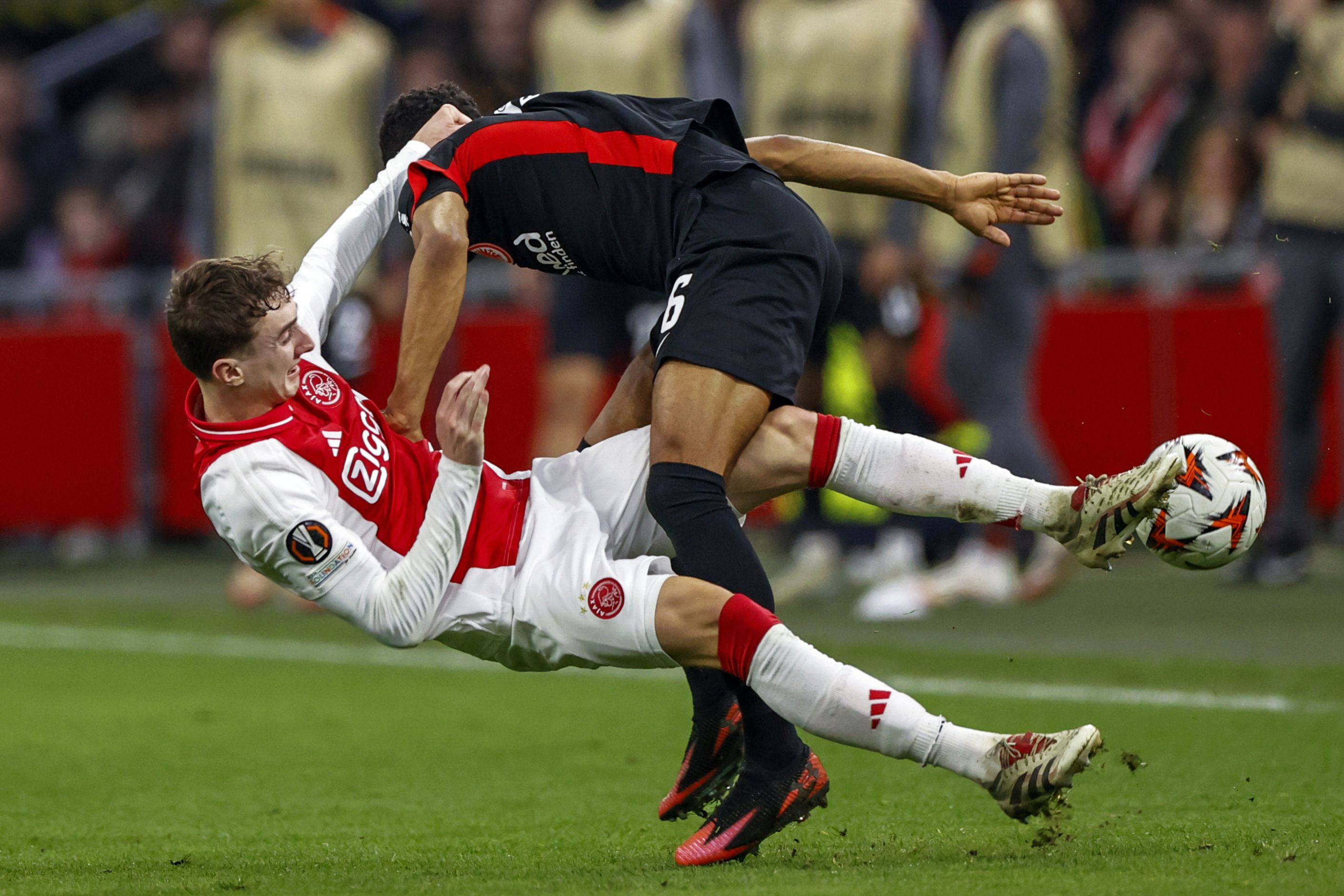 Eintracht Frankfurt's Ansgar Knauff, top, duels for the ball with Ajax's Youri Baas during the Europa League round of 16 first leg soccer match between Ajax and Eintracht Frankfurt at the Johan Cruyff ArenA in Amsterdam, Netherlands, Thursday, March 6, 2025. (Photo by Maurice van Steen/AP Photo)
