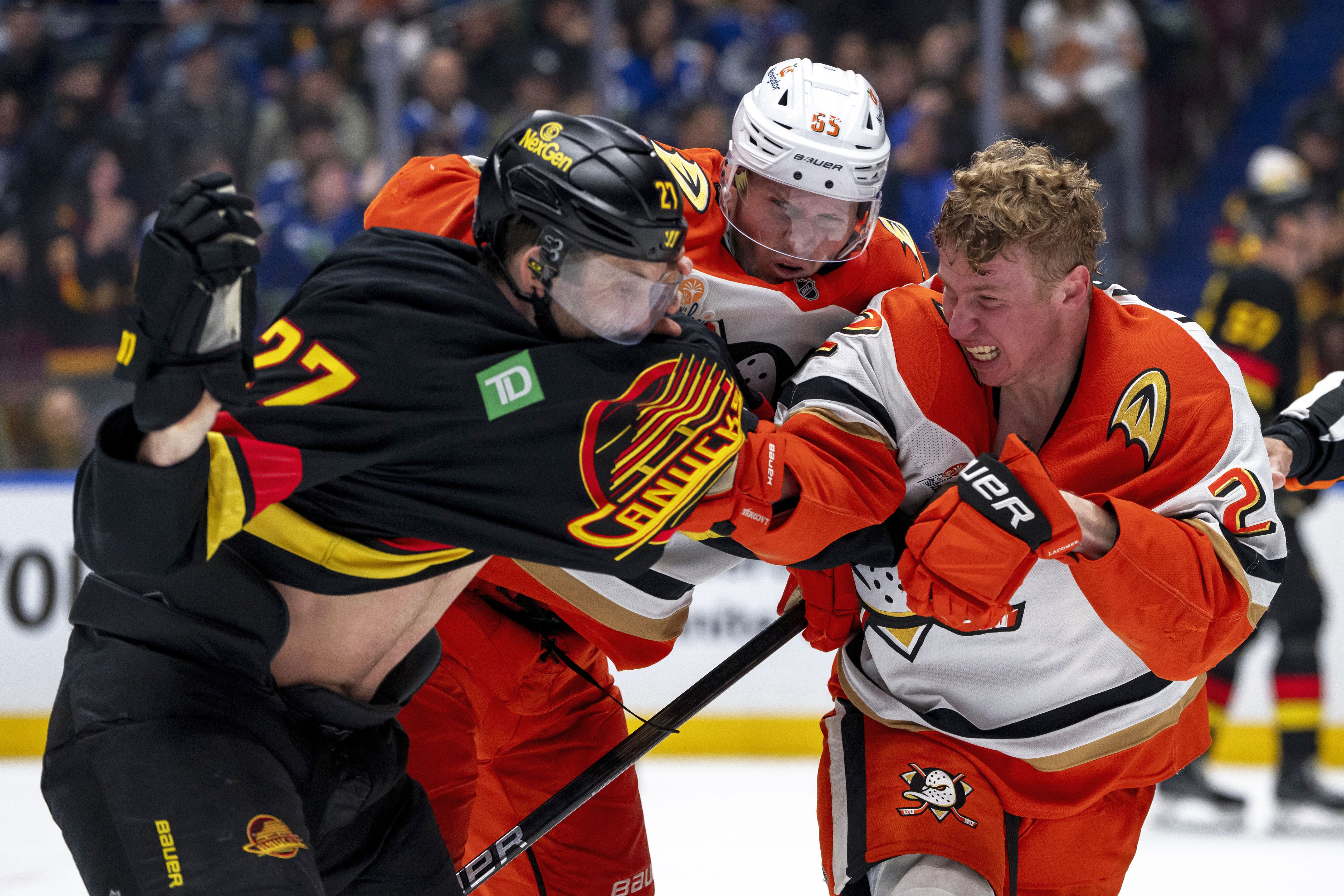 Anaheim Ducks' Jacob Trouba (65) and Jackson LaCombe (2), fight with Vancouver Canucks' Derek Forbort (27) during the third period of an NHL hockey game in Vancouver, B.C., on Wednesday, March 5, 2025. (Photo by Ethan Cairns/The Canadian Press via AP Photo)