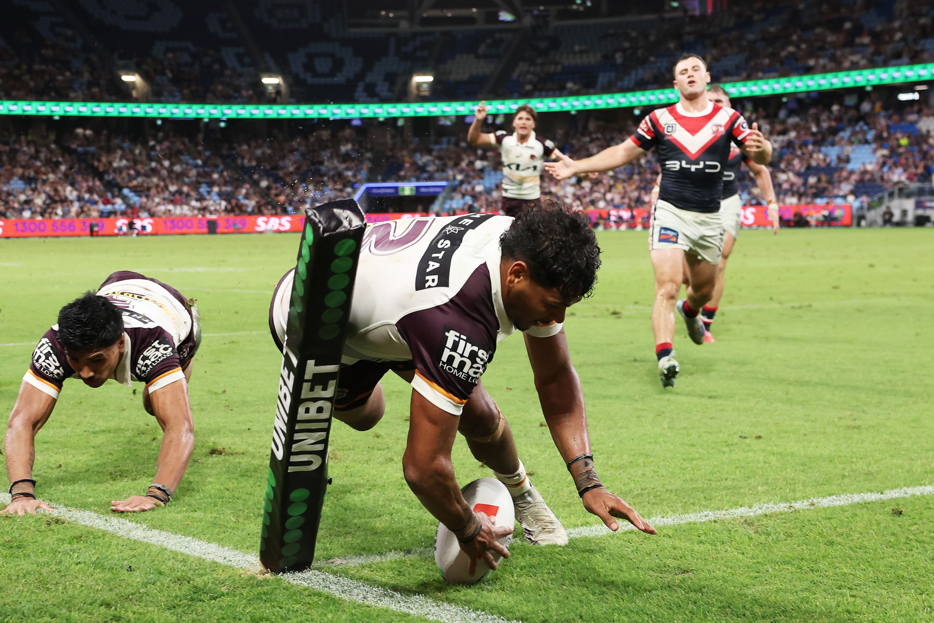 Selwyn Cobbo of the Broncos scores a tryduring the round one NRL match between Sydney Roosters and Brisbane Broncos at Allianz Stadium, on March 06, 2025, in Sydney, Australia. (Photo by Matt King/Getty Images)