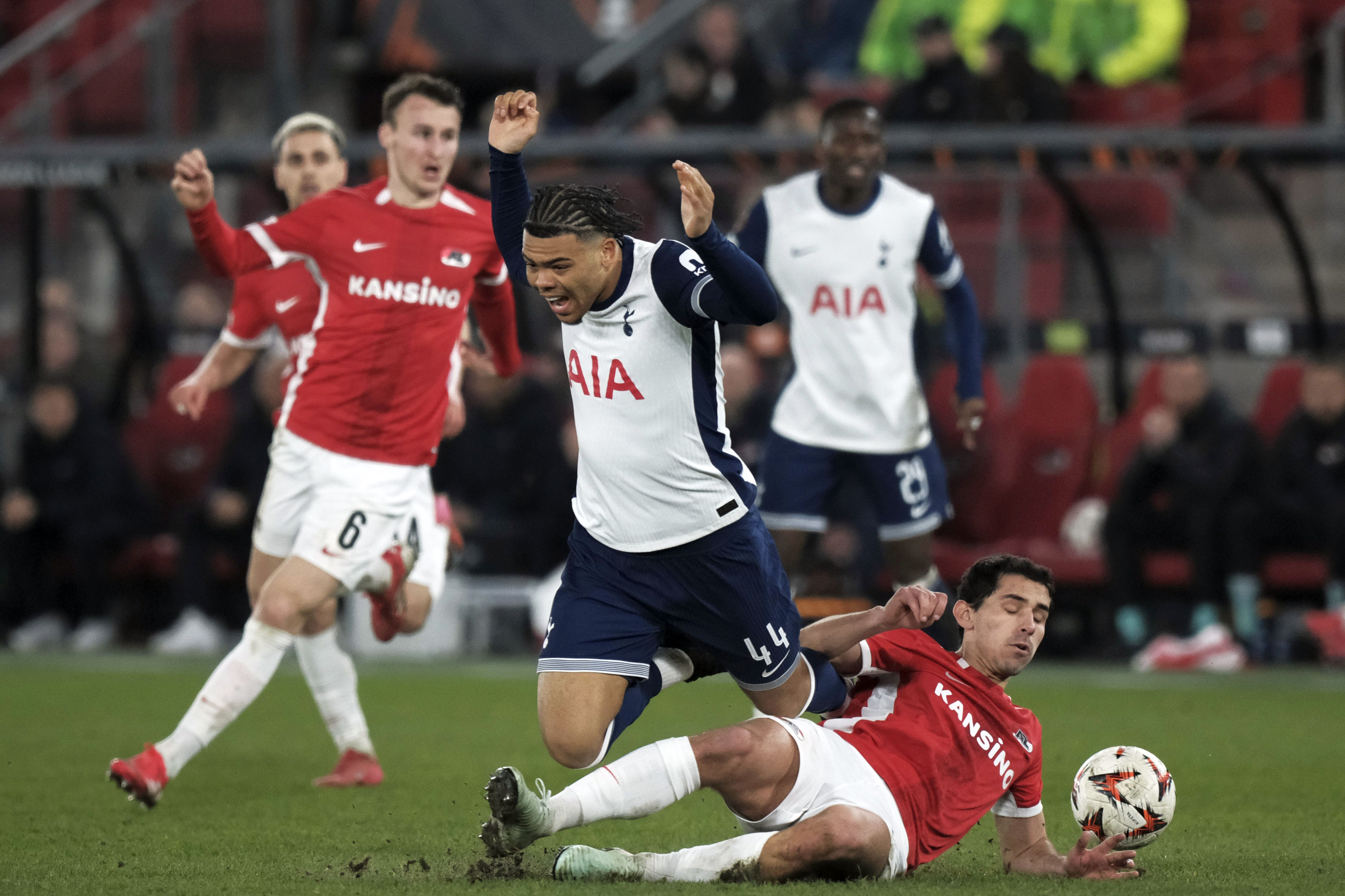 Tottenham's Dane Scarlett is tackled by AZ Alkmaar's Wouter Goes during the Europa League round of 16 first leg match between AZ and Tottenham at AFAS Stadium, in Alkmaar, in Alkmaar, Netherlands, Thursday, March 6, 2025. (Photo by Patrick Post/AP Photo)