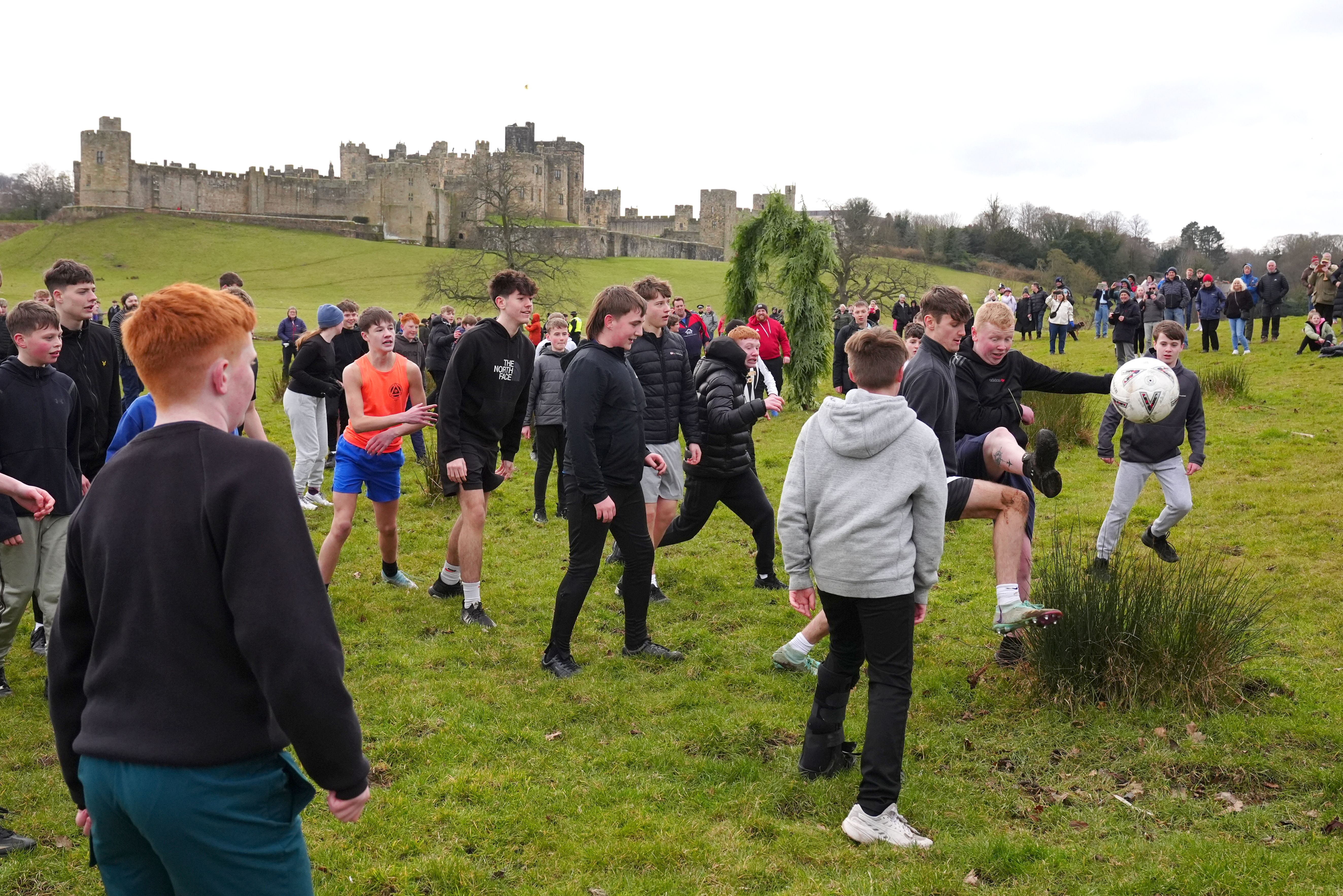 Players during the annual Shrovetide football match in Alnwick, Northumberland, UK on Tuesday, March 4, 2025. Competitors play next to Alnwick Castle in the game that has taken place since 1762. (Photo by Owen Humphreys/PA Wire)