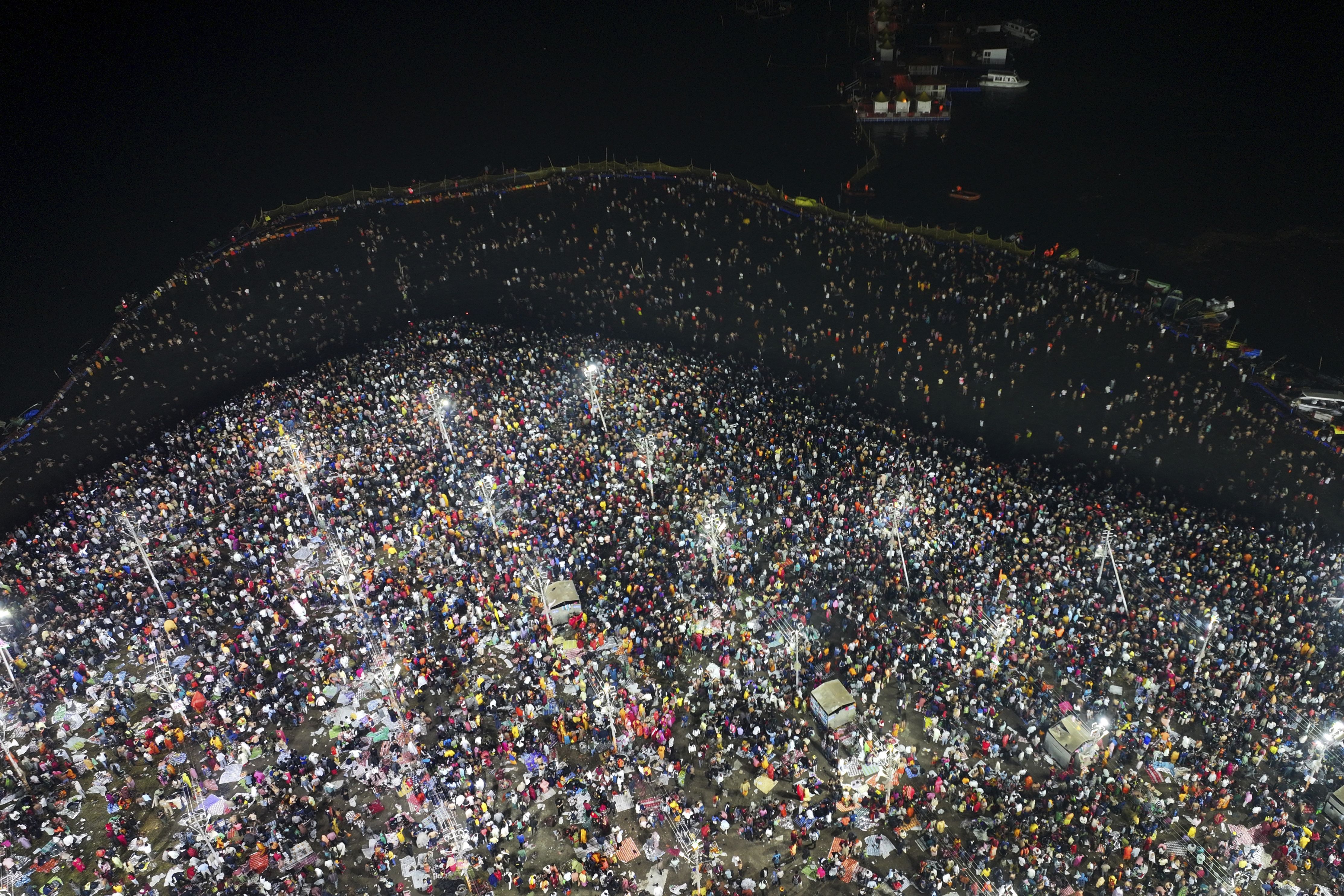 Hindu devotees take ritualistic dips at the confluence of the rivers Ganges, Yamuna and mythical Saraswati on Shivaratri festival on the final day of Maha Kumbh festival, in Prayagraj, Uttar Pradesh, India, Wednesday, February 26, 2025. (Photo by Rajesh Kumar Singh/AP Photo)